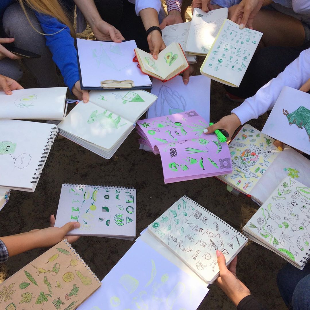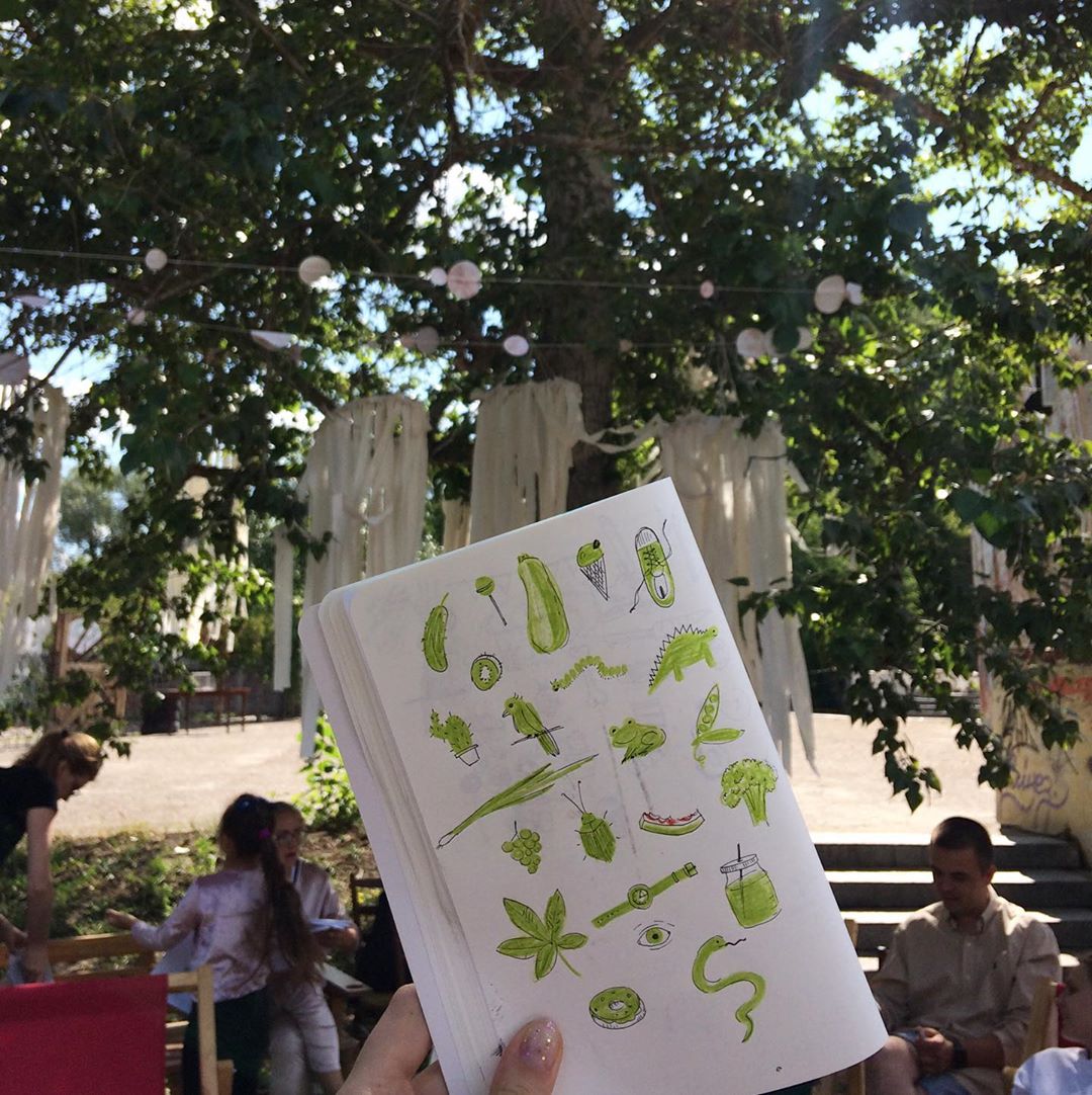 Взагалі-то у нас поки немає якоїсь періодичності, тому зустрічей було тільки дві. Захотілося, з'явився час — провели... Зараз я думаю про організацію третьої зустрічі і хочу, щоб вона була трохи іншою за форматом. На зустрічі, які вже відбулися, я готувала/вигадувала різні завдання для малювання, але першочергово мені не хотілося цього всього робити. Хотілося зібратися, зробити невелику розминку, а потім кожен малює, що йому хочеться. Та перша тестова зустріч виявила, що без завдань усі якось нітяться (і я також 🙂 ). На другу зустріч я вже капітально підготувалася. У нас була тематика, фішка та пов’язані між собою завдання — “Зелений двіж”. Зібралося більше 20 людей, і це вже зовсім інший левел відповідальності. Так і до майстер-класів недалеко 🙂