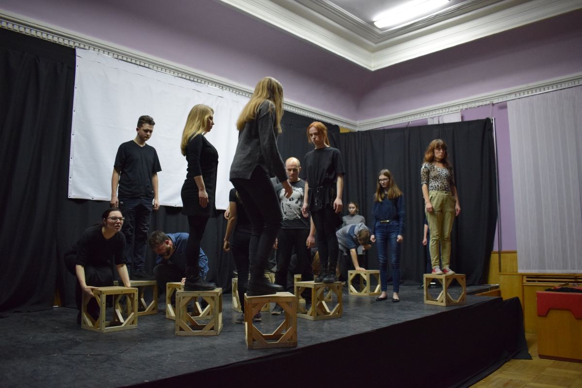 Тетяна: Я ще обов’язково хочу згадати про хлопця, який нам робив ці куби. Його звати Льоша, а от прізвище я навіть не знаю. Ми з ним співпрацювали ще коли робили благодійну виставу «Олівер Твіст», і от знову. Найцікавіше, що він же не займається театральними декораціями, а я йому по-дівчачому намагалася пояснити, що ми від нього хочемо, як мають виглядати ці куби, яка сторона має бути закритою, яка відкритою, і щоб вони витримували людей.