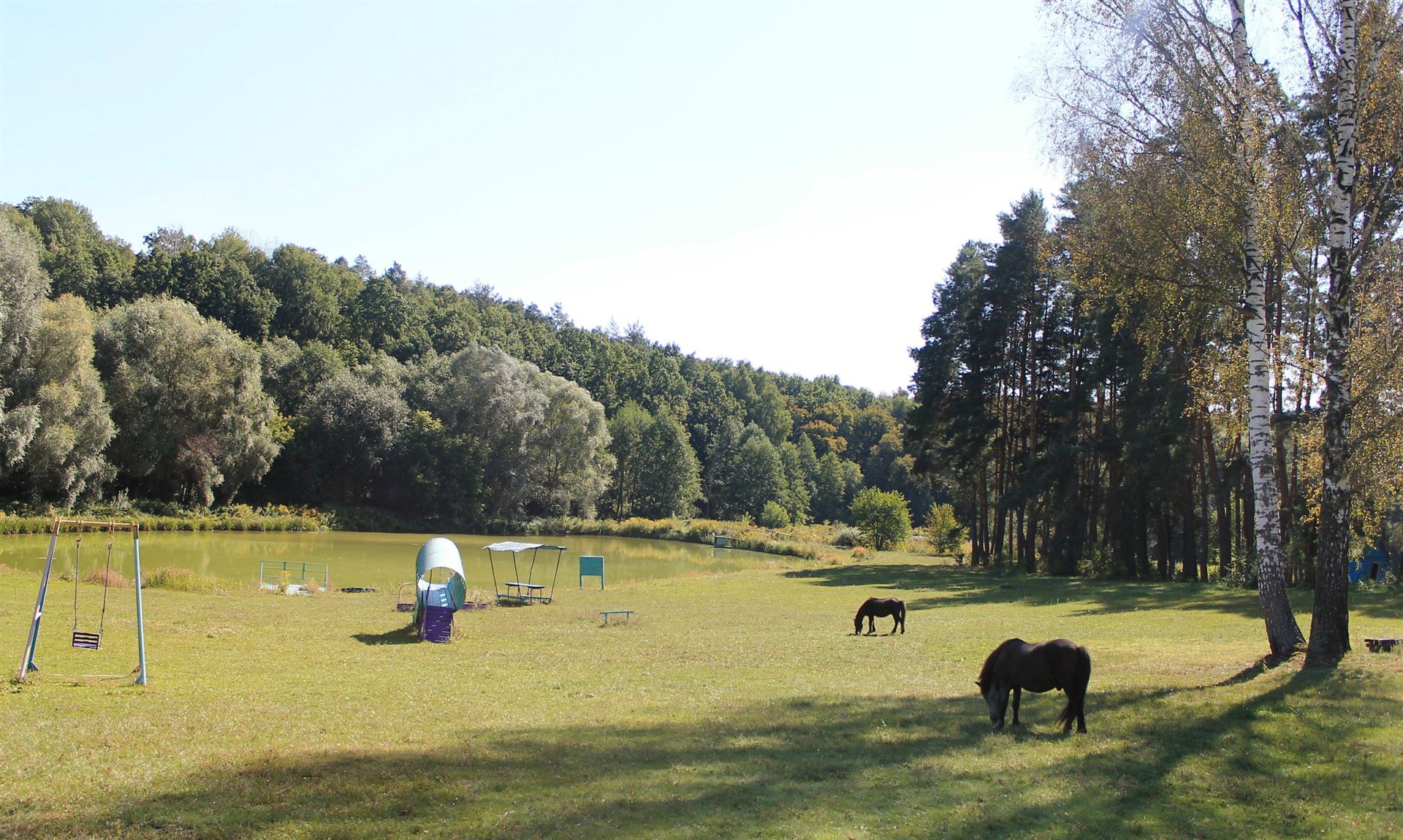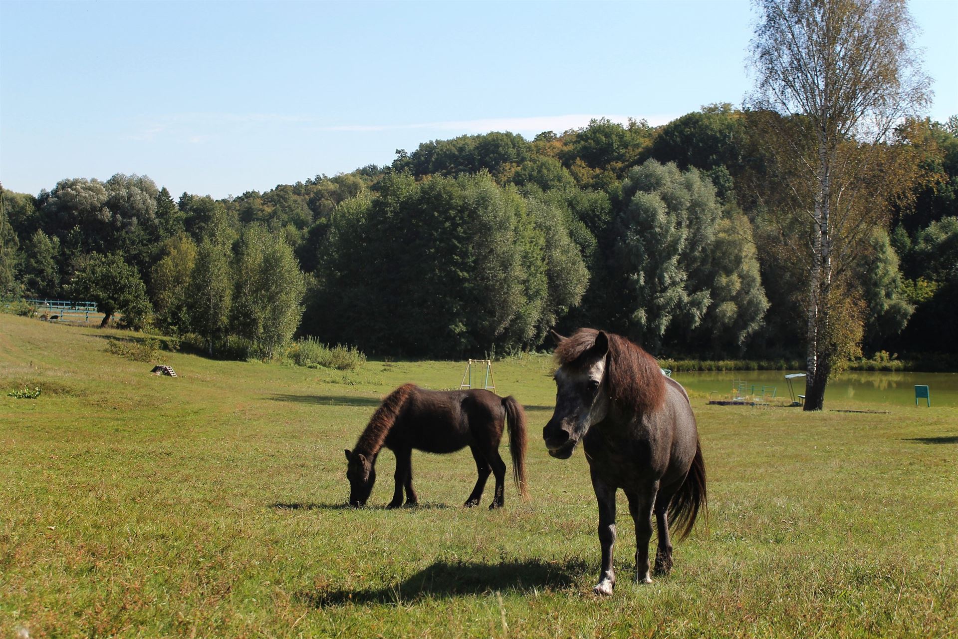 Одразу за корпусами відділення розкинувся ставок, а навколо нього — акуратно підстрижені газони. Двоє чорних поні охоче підходять знайомитися й дають себе почухати між вухами.