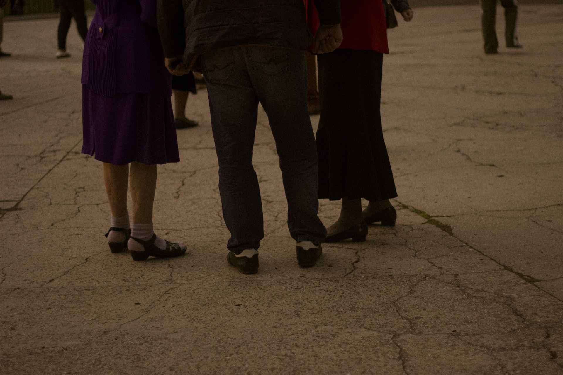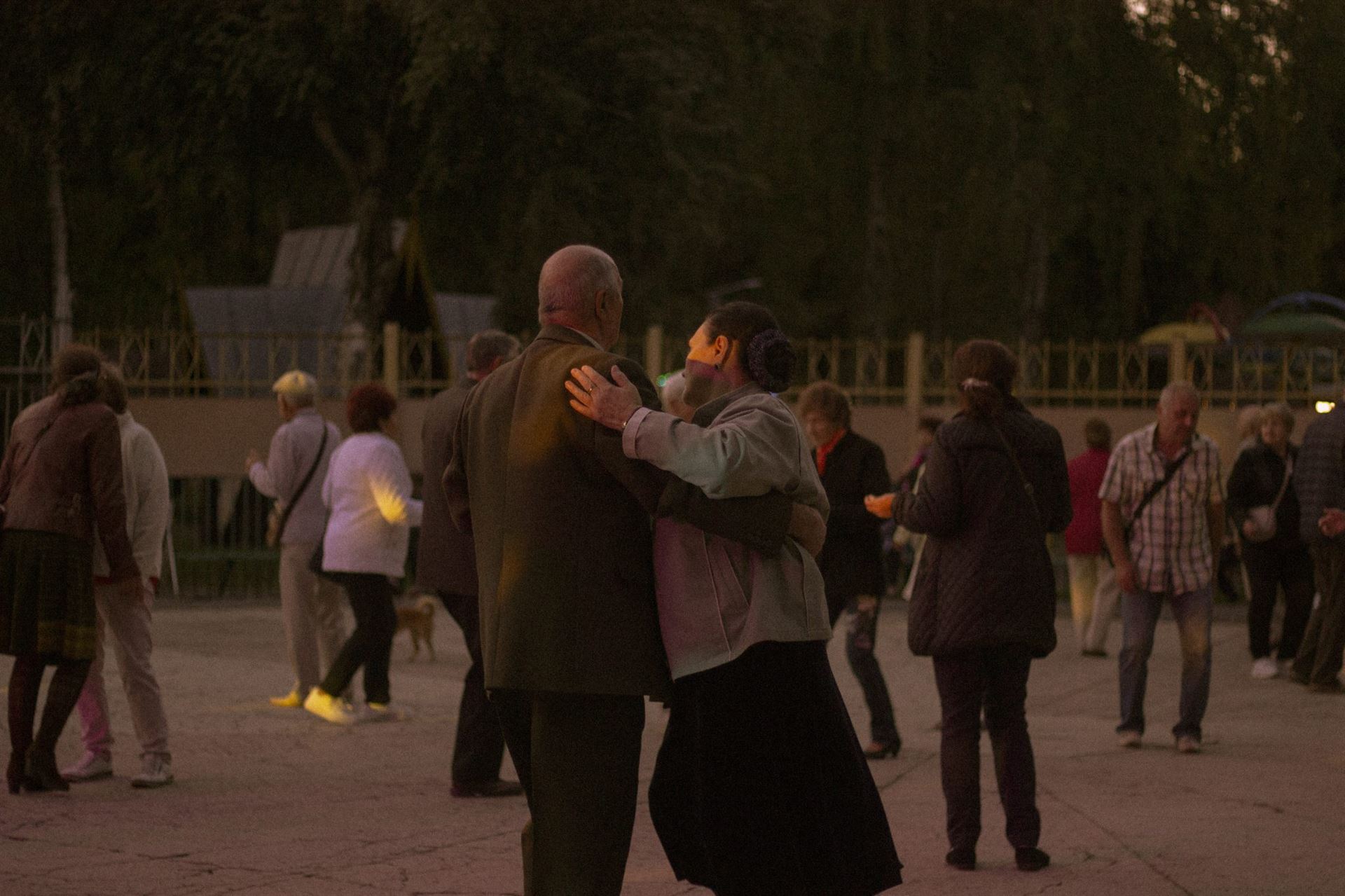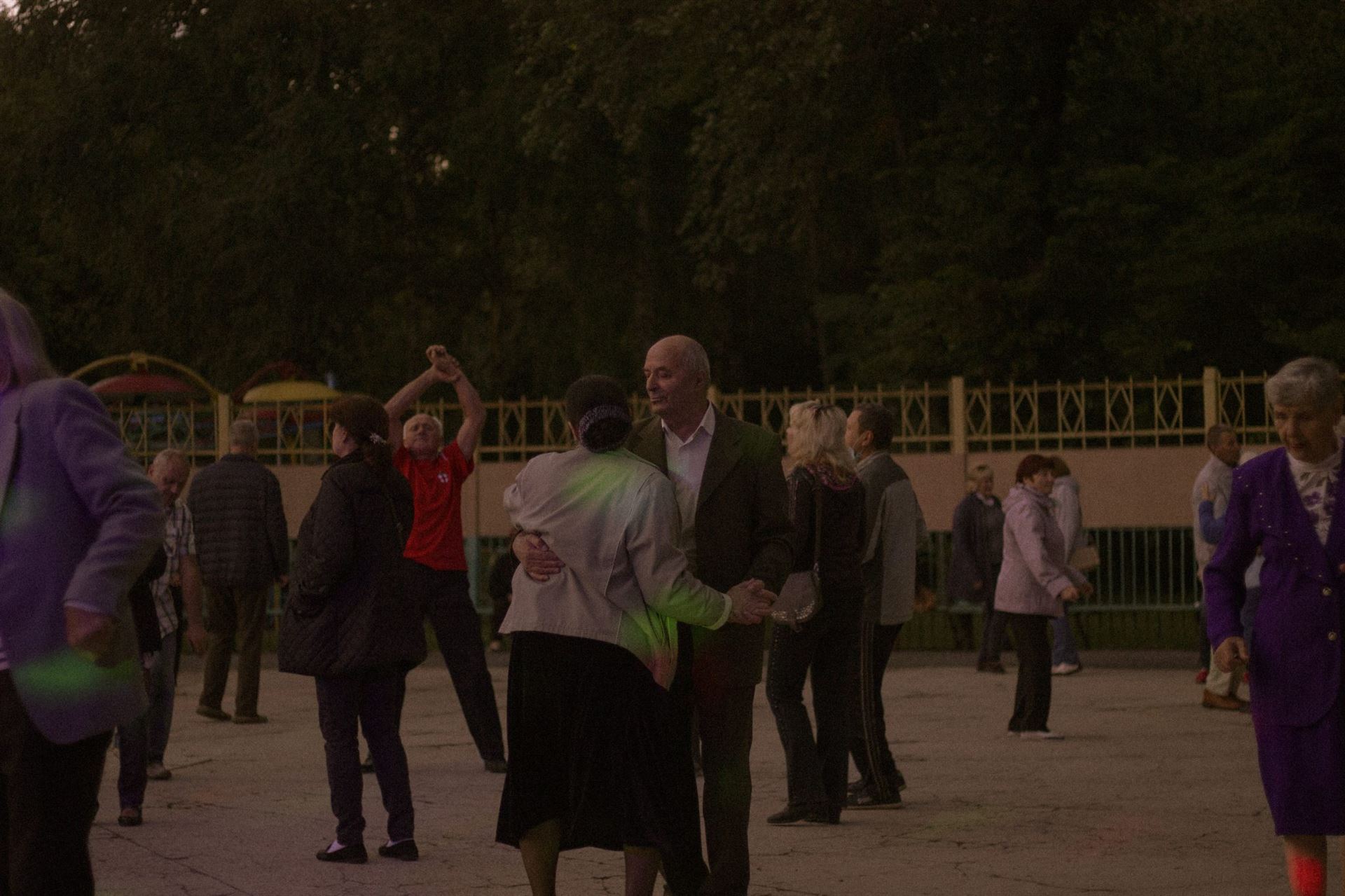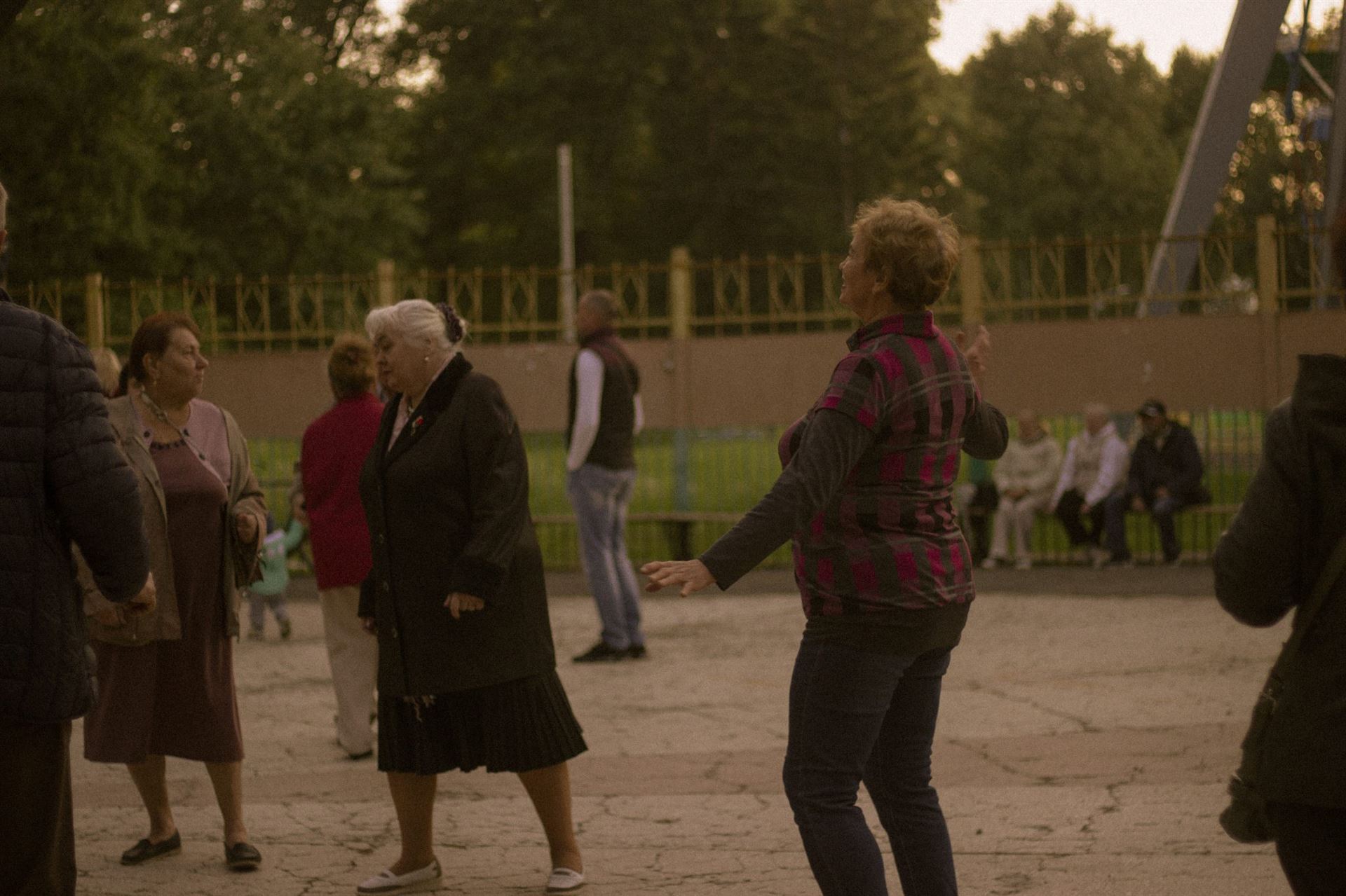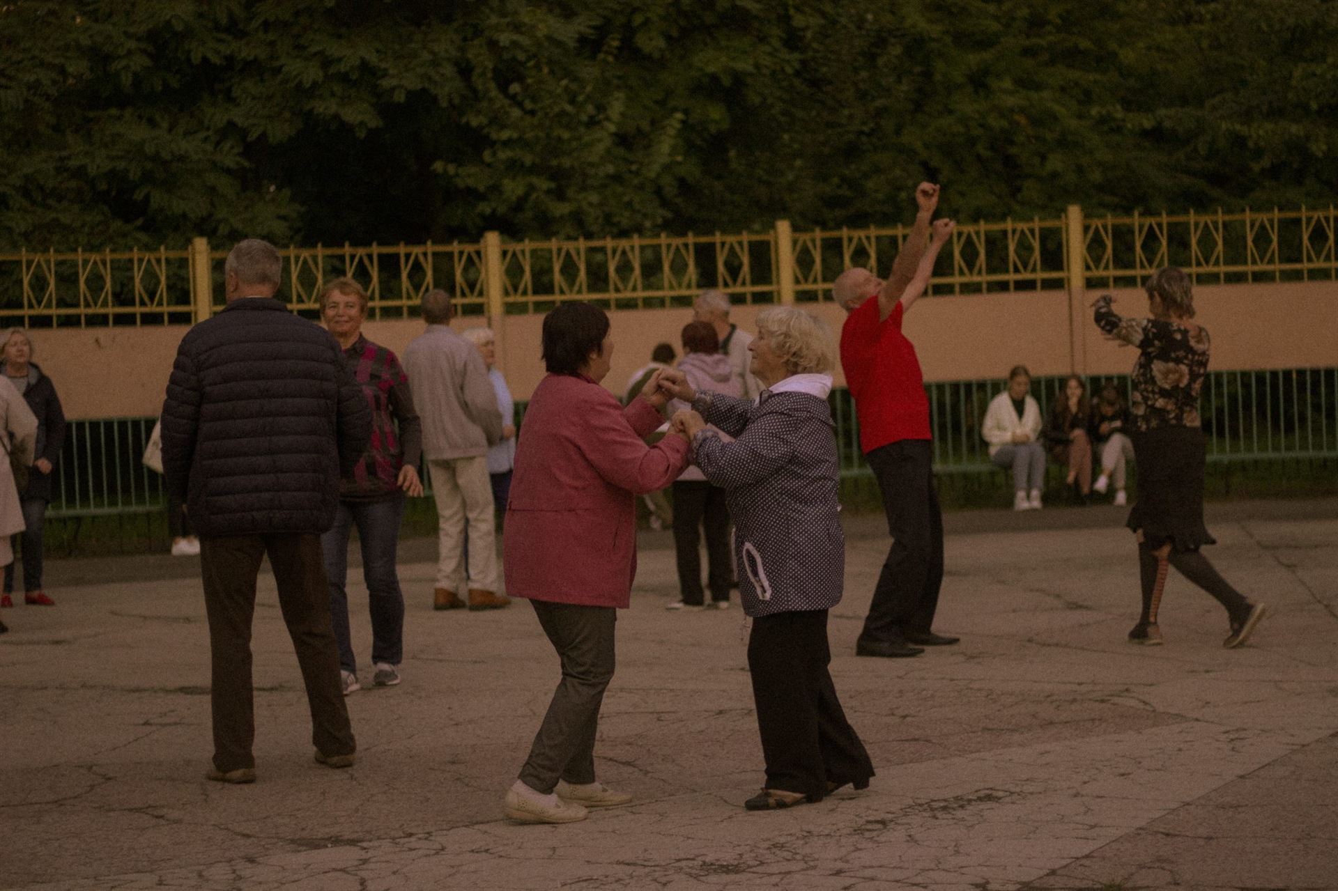 Ближче до сьомої людей на майданчику назбиралося багацько. Підтягнулася й молодь. Але стоїть вона здебільшого за парканом, посміхаючись дійству та не наважуючись зайти. Люди старші ж — навпаки. Пішли в танок навіть ті, хто ще недавно запевняв: «Не танцюю, бо ноги болять». Одна з них — Валентина Кирилівна, яка разом з подружками вже з пів години на свій лад відтворює елегантні «фондю» та ритмічні «фрапе».