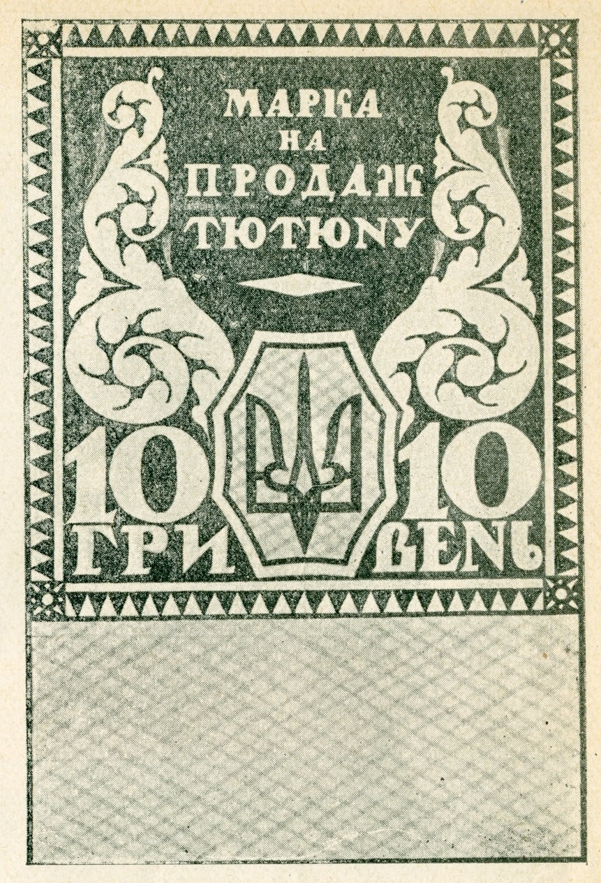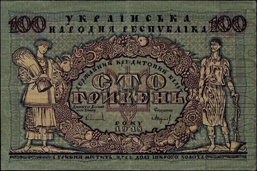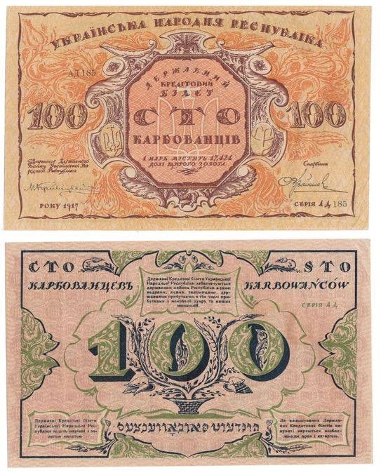 У грудні 1917 року за ескізом Нарбута надрукували першу партію 100 карбованцевих купюр із серійним номером 185. Дизайн 100 карбованців виконаний у дусі українського бароко та містить декоративні шрифти, зображення Тризуба та куші. Так Тризуб повернувся на гроші нової держави – Української Народної Республіки.