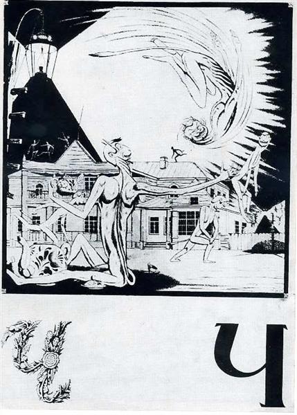 Чого варта тільки літера «Ч» – чорт з чайником у руках дивиться на чехарду чортенят перед будинком, який Нарбут замалював у селі Рутка. Цілком гоголівська стихія
