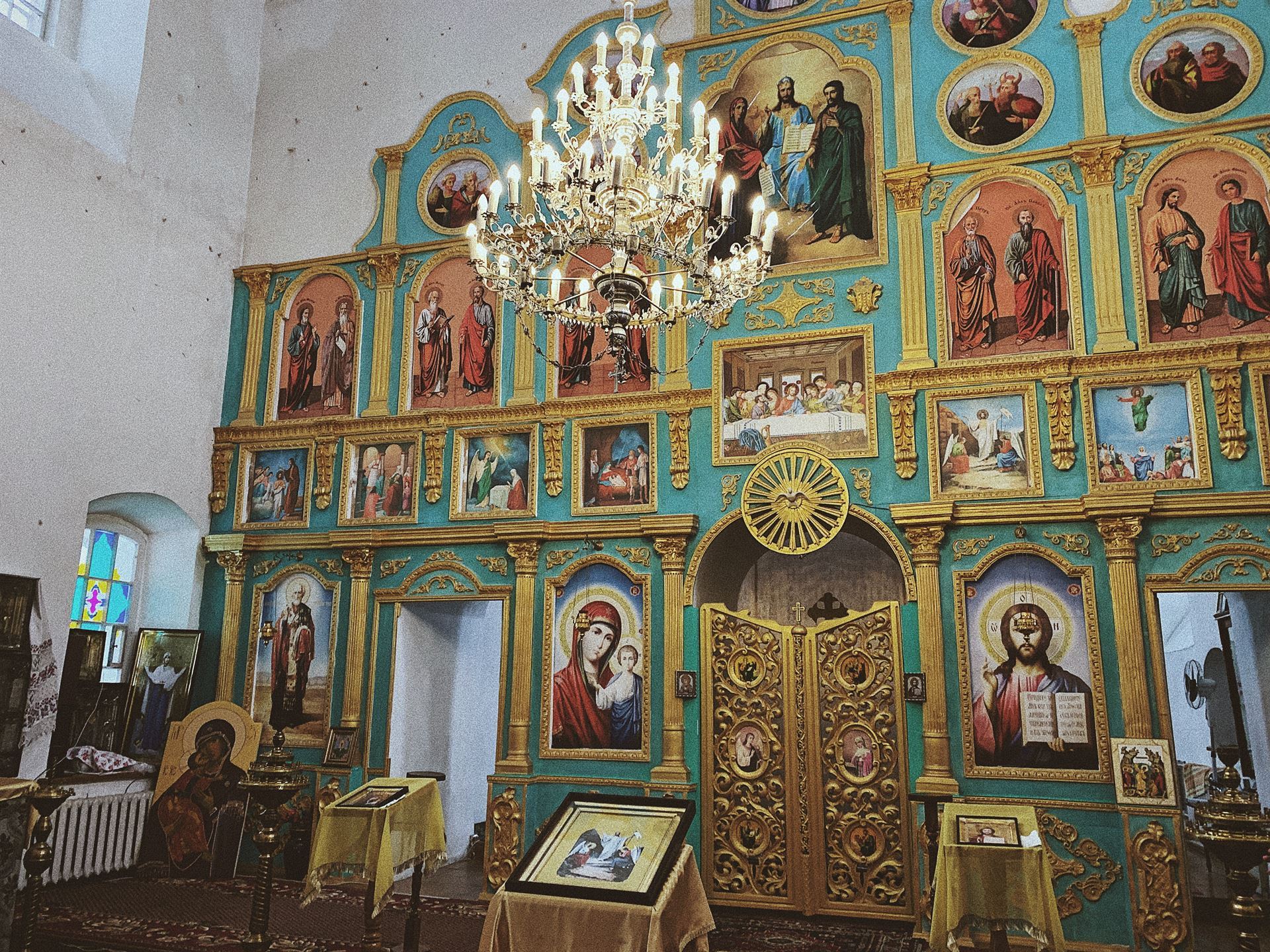 Поки підіймаємося старими сходами, слухаю історію про Герасима Кондратьєва, який імовірно похований у церкві, Сковороду, який тут молився, та готель «Воскресенський» із казино, що раніше були частиною собору. Заходимо до холодного приміщення з іконами на голих стінах та килимами на скрипучій підлозі.