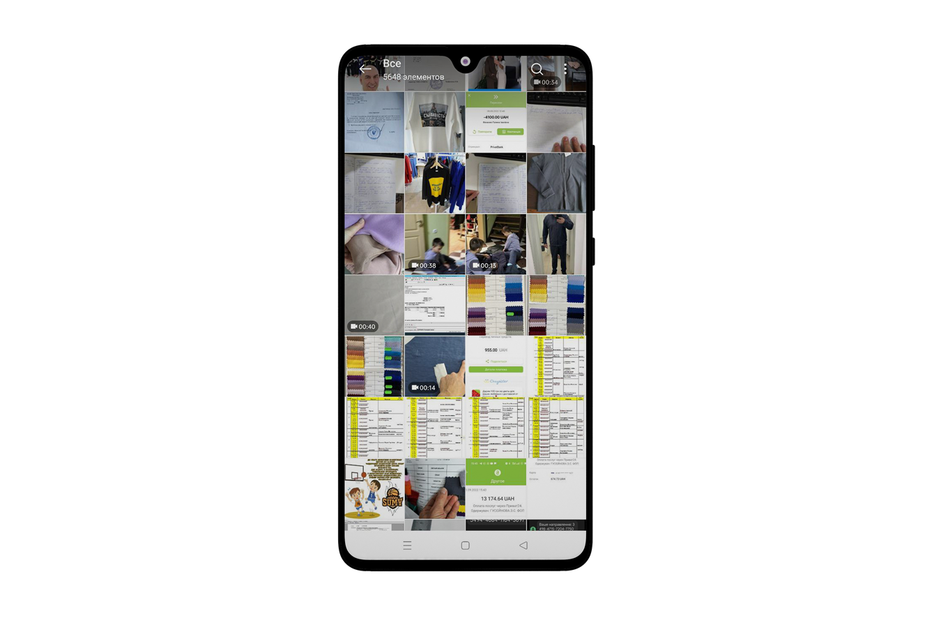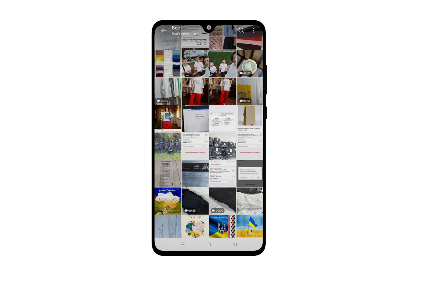 У телефоні намагалася вести нотатки, застосунки для контролю фінансів, але припинила через брак часу. Тому використовую лише програми банків, фейсбук, інстаграм та «Нову пошту». Для листування є телеграм із робочим чатом. У галереї здебільшого знімки екрана, проплати тканин і фото моделей. Тут і параметри флісової куртки, і палітра кольорів від постачальників, і новий прайс. На відео міряю нову блузу і розповідаю собі, як сидить рукав. Далі йде родина — діти розпаковують подарунки від бабусі, фото із дня народження бабусі та діти, які розпаковують подарунки.