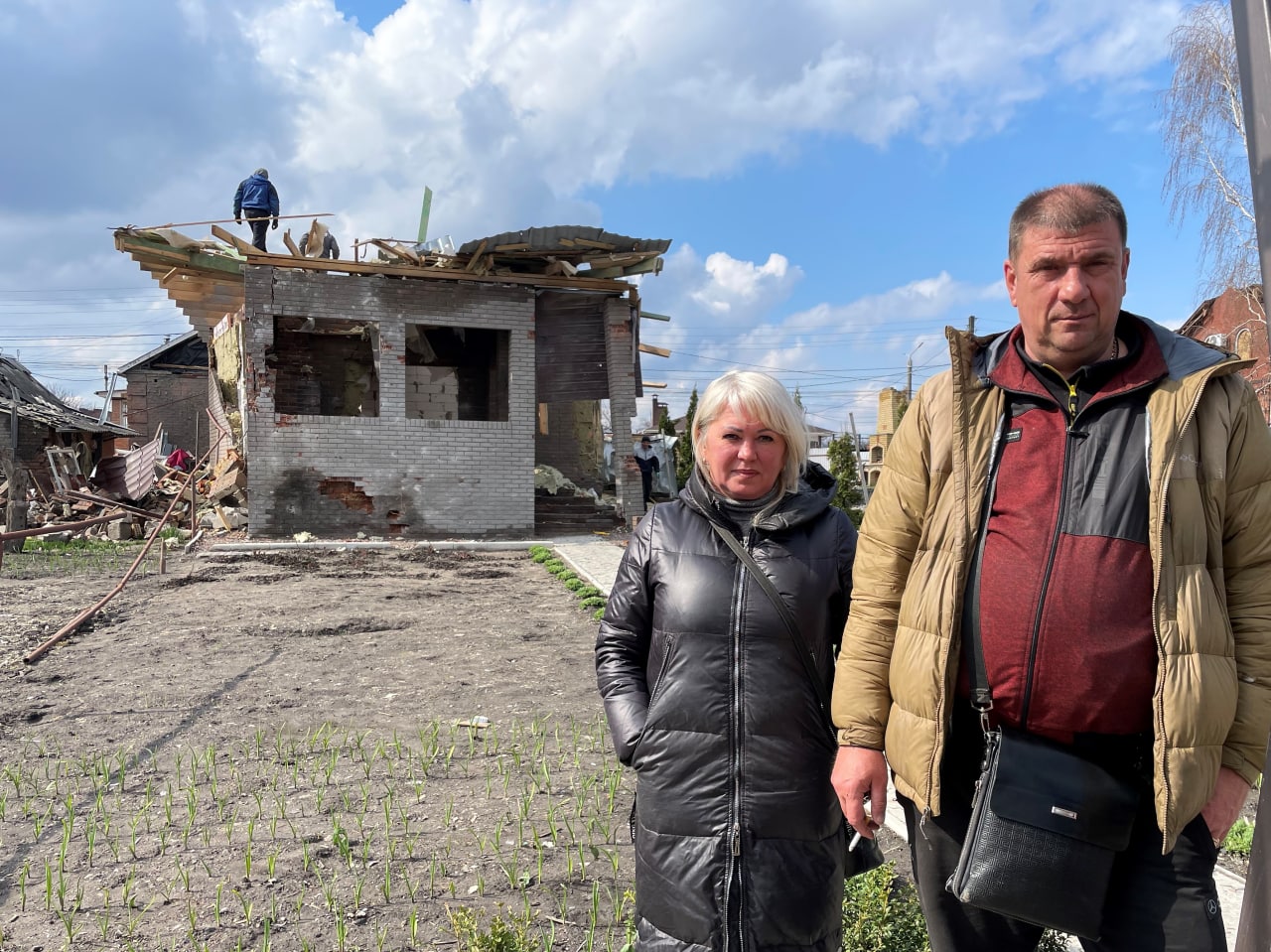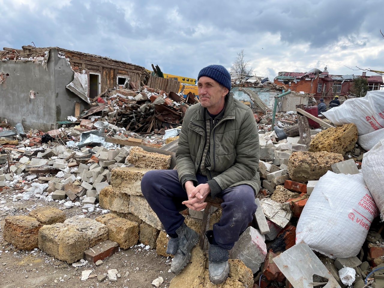 «Тут був і буде мій будинок! Хай тільки закінчиться війна», — говорить він. Коли все сталось, Олег, як і його сусіди, спав. Сирени не чув, та і впевнений, не було її. «На тому дивані спав, на другому поверсі, — показує він на край дивана, який звисає над рятувальником, що розбирає залишки стіни його будинку. — Там мене і привалило. Але я звільнився самотужки, а от дружину вивільняли надзвичайники». За мить Олега кличе сусід. Ще за мить чоловік вже допомагає розбирати руйнування.
