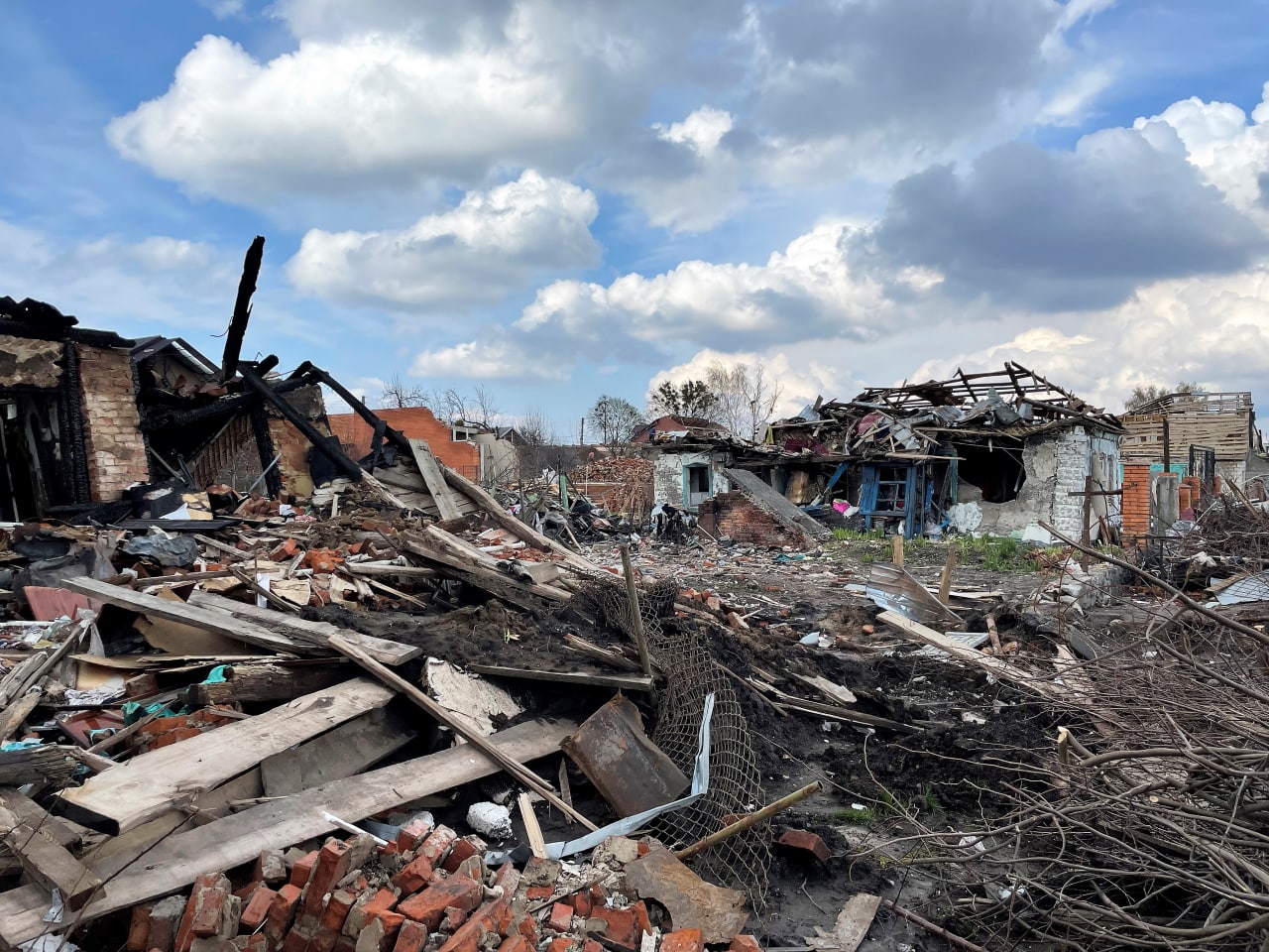Прямо навпроти воріт — зруйнована будівля. Якась залізна конструкція видає гидкий скрипучий звук, ніби з фільму жахів. Зліва — навантажувач згрібає рештки чийогось помешкання. Надокучлива ворона намагається вихопити щось з його ковша. Навпроти — береза, на гілках якої дитячою люлькою зачепилась і гойдається чорна тряпчина. Прямо під березою — фундамент, по якому де-не-де розкидане взуття, картки для настільної гри та сторінки з дитячої книжки. Тут у двоповерховому будинку жила велика родина. Але після 7 березня не вижив ніхто. «Жили дружно, всі один одного знали. Ми будували новий будинок, до якого планували заїхати вже цього літа», — розповідає Віта, сусідка загиблої родини.