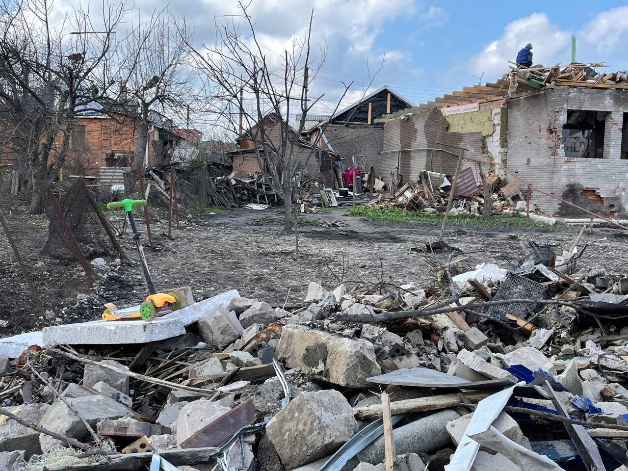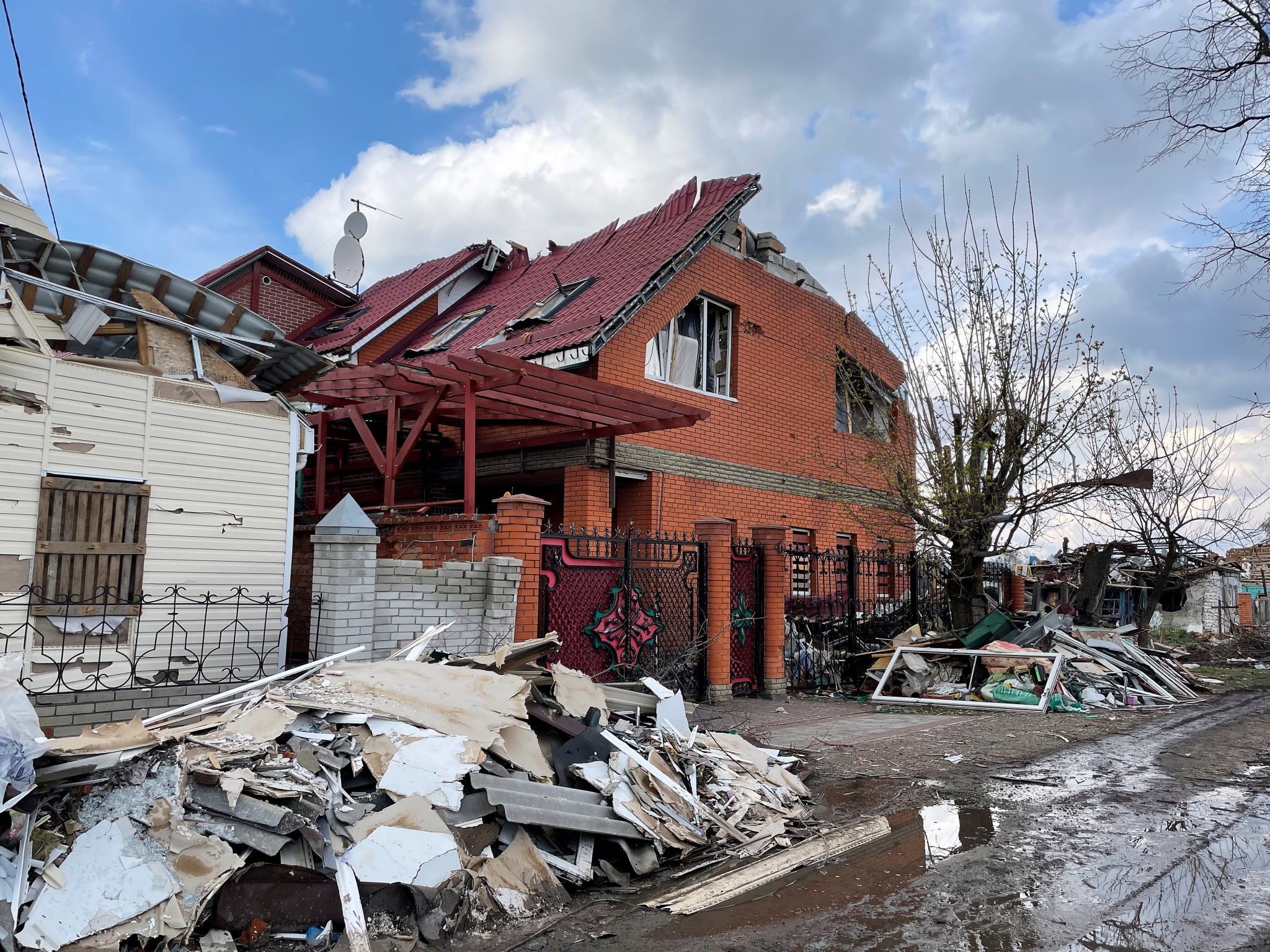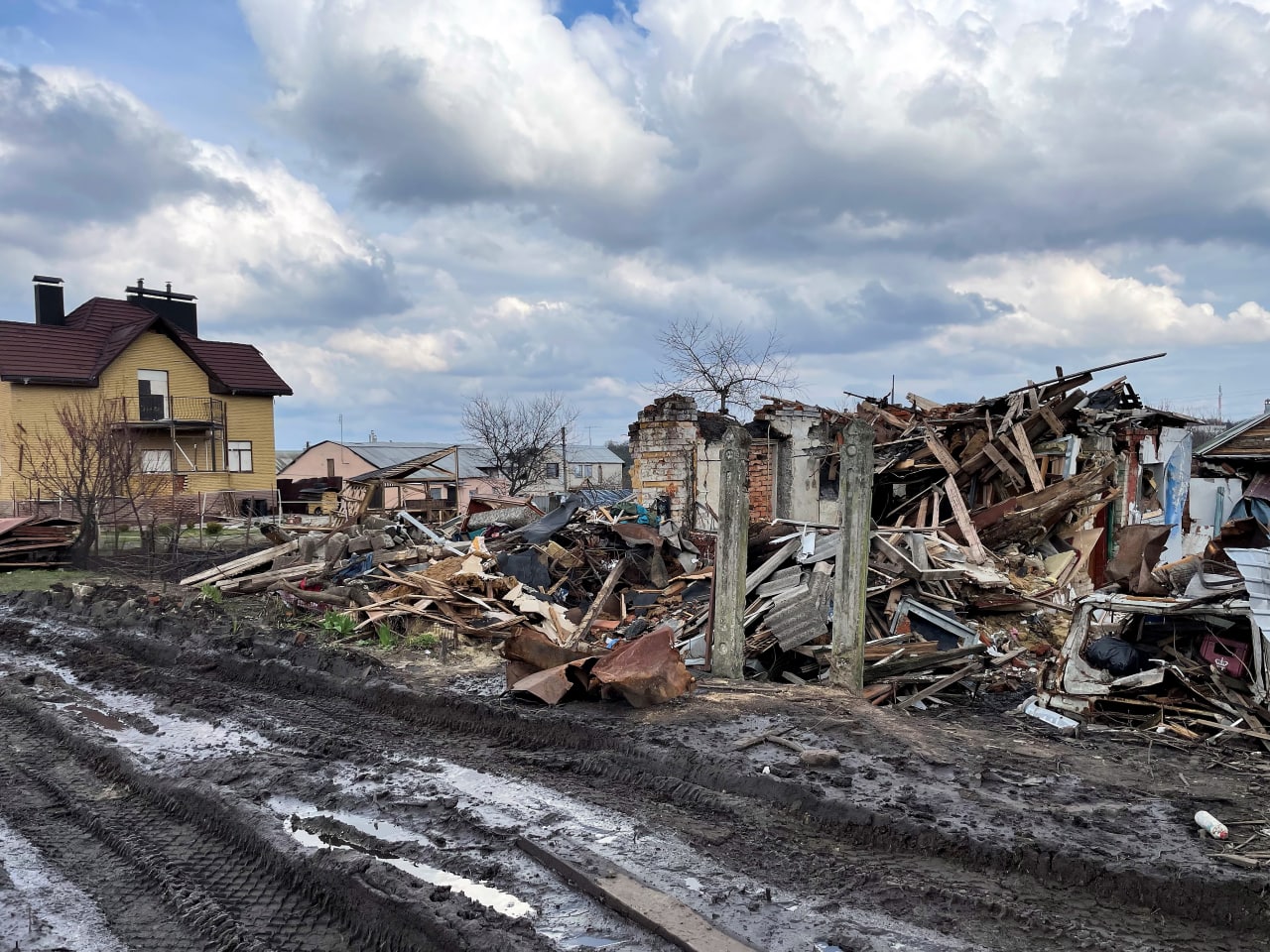 Прямо навпроти воріт — зруйнована будівля. Якась залізна конструкція видає гидкий скрипучий звук, ніби з фільму жахів. Зліва — навантажувач згрібає рештки чийогось помешкання. Надокучлива ворона намагається вихопити щось з його ковша. Навпроти — береза, на гілках якої дитячою люлькою зачепилась і гойдається чорна тряпчина. Прямо під березою — фундамент, по якому де-не-де розкидане взуття, картки для настільної гри та сторінки з дитячої книжки. Тут у двоповерховому будинку жила велика родина. Але після 7 березня не вижив ніхто. «Жили дружно, всі один одного знали. Ми будували новий будинок, до якого планували заїхати вже цього літа», — розповідає Віта, сусідка загиблої родини.