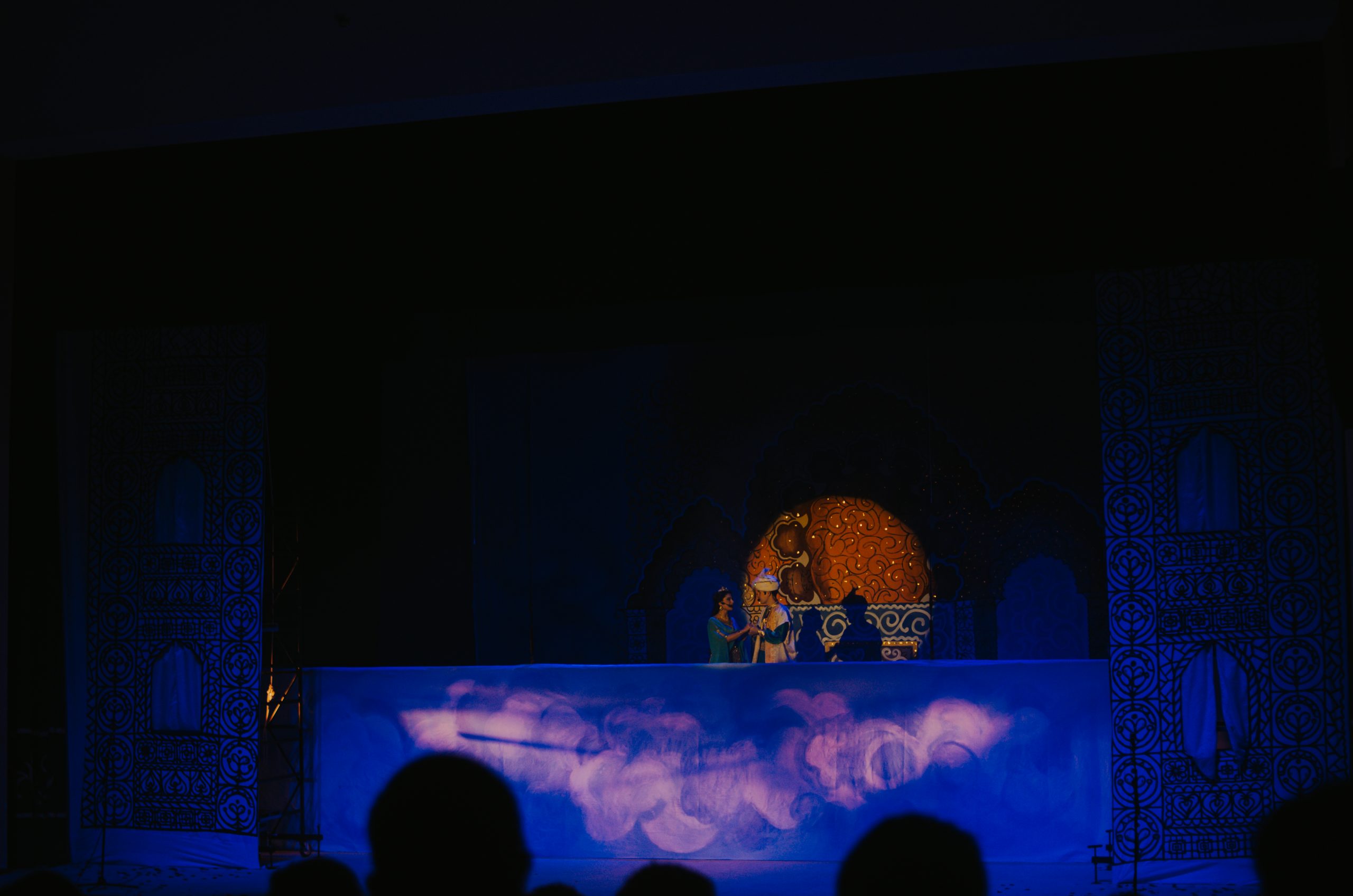 — Цього разу ми з живою музикою граємо — он там, внизу, сидітиме оркестр і виконуватиме варіації пісень з «Аладдіна». А взагалі у нас є два варіанти вистави: один — коли вся музика жива, інший — коли оркестр звучить на записі, а артисти все одно наживо співають.