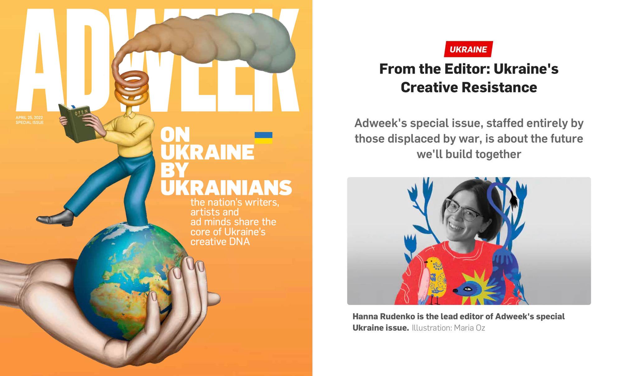 У кінці квітня вийшов номер американського журналу «Adweek», повністю створений українською командою. Головною редакторкою випуску «Про Україну від українців» стала сумчанка Ханна Руденко. Це — безпрецедентний випадок для «Adweek». Вперше за 43 роки існування редакція журналу відійшла від процесів, запросивши українських креаторів, життя яких торкнулася війна, підготувати статті та ілюстрації для нового випуску. Цукр поговорив з Ханною про те, як створювався український номер журналу та про майбутню поїздку до Канн, де обговорюватимуть важливі питання про український креатив.