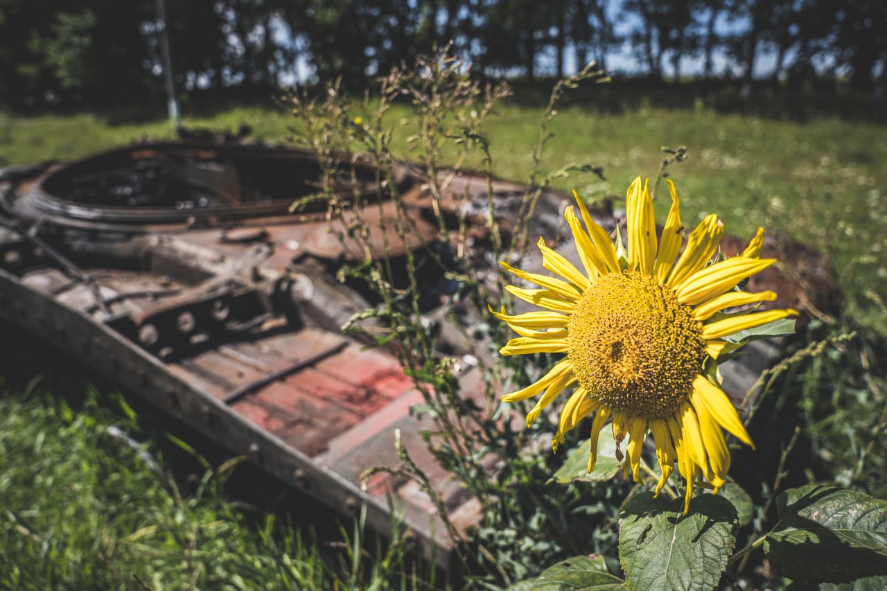 Чим ближче наближалися до прикордоння, тим менше машин зустрічали на шляху. На асфальті видніються сліди від гусениць танків, як нагадування, що не так давно тут їздила ворожа техніка. Не доїжджаючи до Краснопілля бачимо спалений російський танк, що вже заріс травою та квітами. Він наче символізує, що попри все — життя триває.
