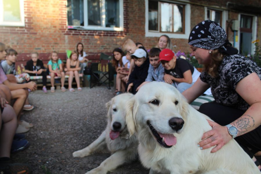 У Сумах живе кінологиня та ветеринарка Олександра Баканова. Вона любить тварин, а тварини її. Олександра — зооволонтерка й у себе на подвір'ї прихистила понад два десятки песиків з Херсонщини після вибуху на Каховській ГЕС. Також виготовляє натуральні корми для тварин. Ми написали їй та спитали, чи не хотіла б вона до нас завітати. І Олександра приїхала зі своїм вовкодавом і золотими ретриверами до нас у двір. Діти були у захваті від цих тварин.