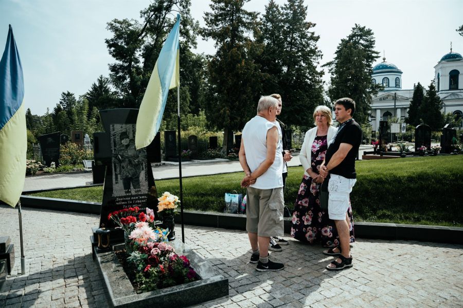 Прапор постійно торкається обличчя Юрія. Де б він не став, той дістає своїм кутиком. На іншому, Петропавлівському кладовищі, теж вітряно. Сьогодні чоловік на цвинтарі з дружиною і двома синами. Один, у чорній вишиванці, допомагає батькові скласти речі. Інший, у камуфляжі, дивиться на нього з гранітної плити.