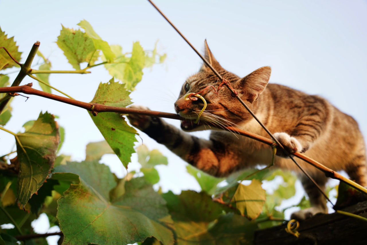 Раптом на винограднику з’являється смугастий кіт. Спочатку він вітає господаря протяжним «Няв», а потім видирається на шпалеру й починає гризти виноградний пагін.