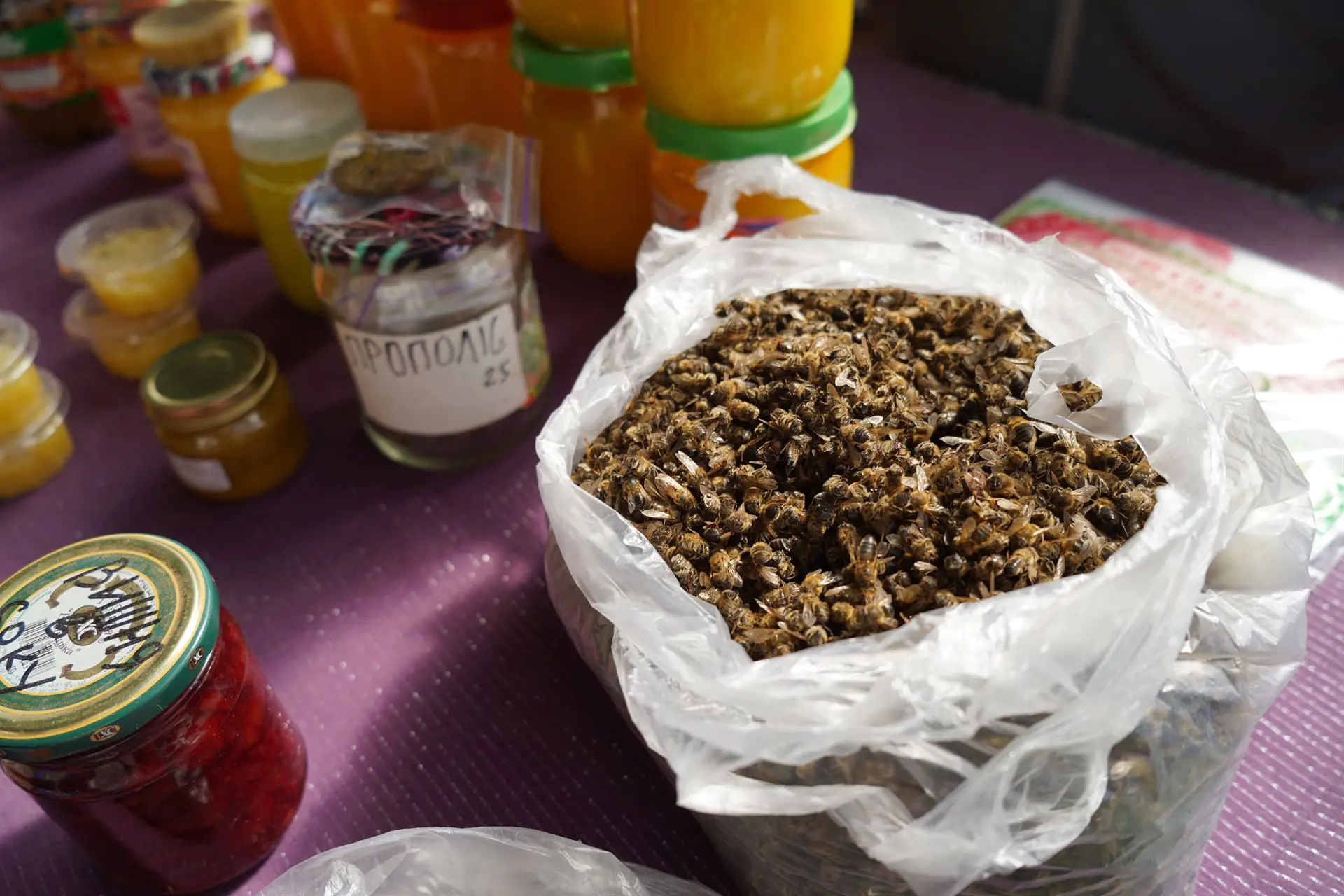 — Зробив прополіс на меду, а не спирті, як зазвичай, бо той не всім підходить і для дітей питають. Методом спроби винайшов рецепт — на базарі такого ні в кого не бачив. Продаю й пилок, його можна вживати по чайній ложці зранку, щоб підтримувати імунітет. Є підмор бджіл — настоянка на засушених бджолах. У їхніх тілах є багато корисних речовин, які неможливо повноцінно отримувати з їжею. Люди краплями залежно від віку додають у склянку води й випивають.
