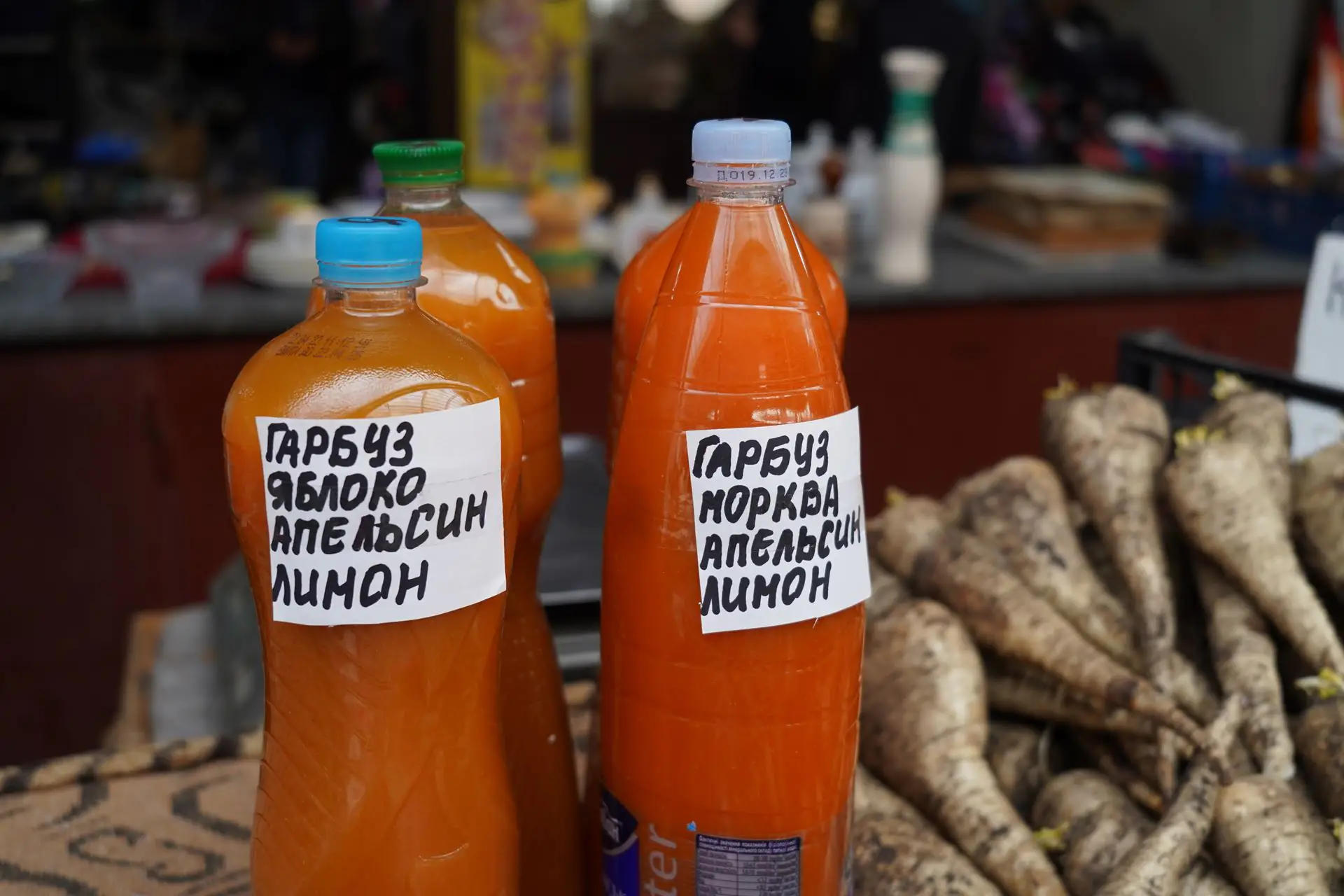 Подружжя продає цибулю, картоплю, але в очі кидаються пляшки з яскравими помаранчевими напоями. Це такі гарбузові смузі, які жінка, говорить, пила з дитинства, коли їх ще товкачкою готувала мама в селі Яструбине сучасної Миколаївської громади.
