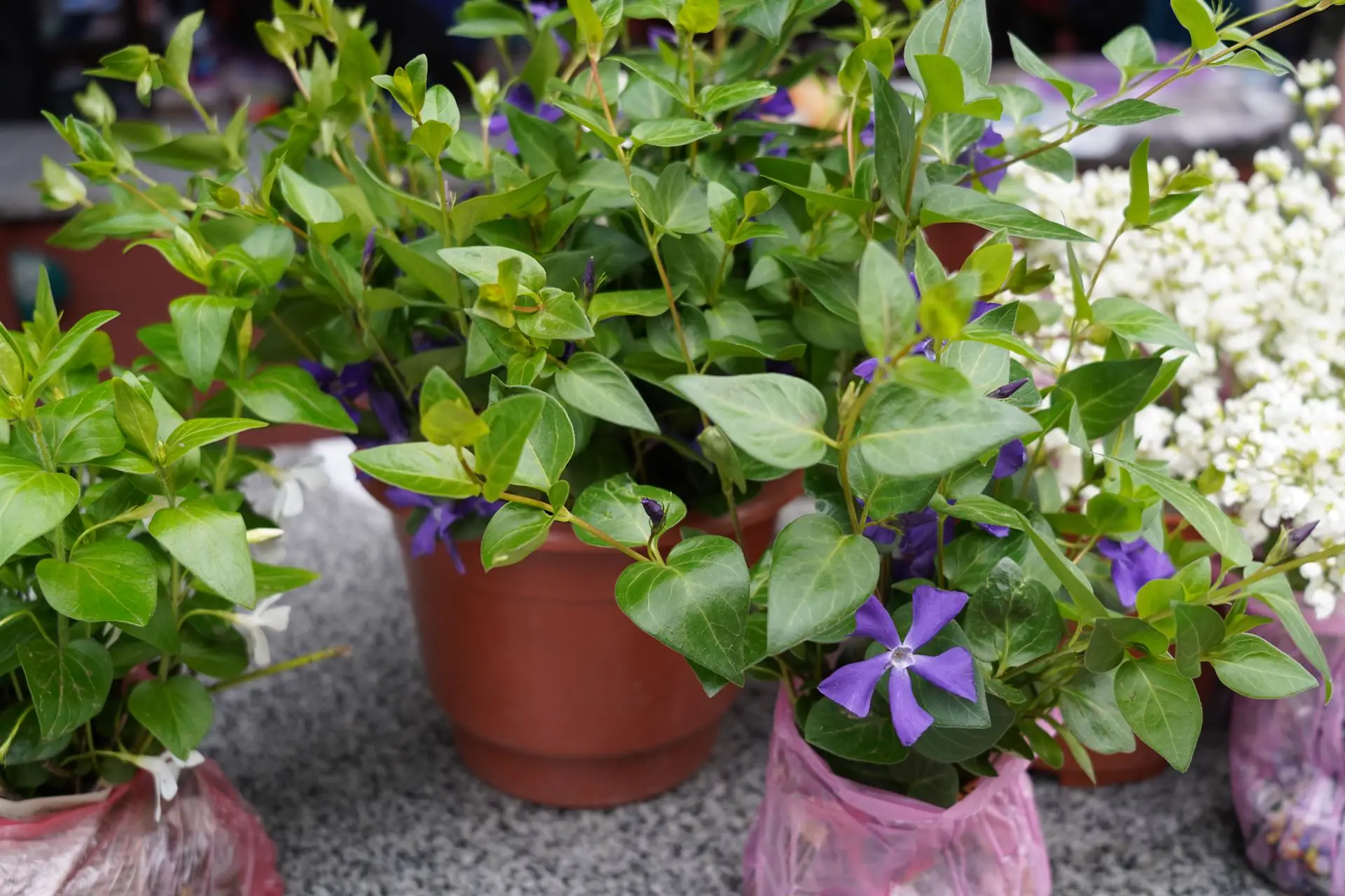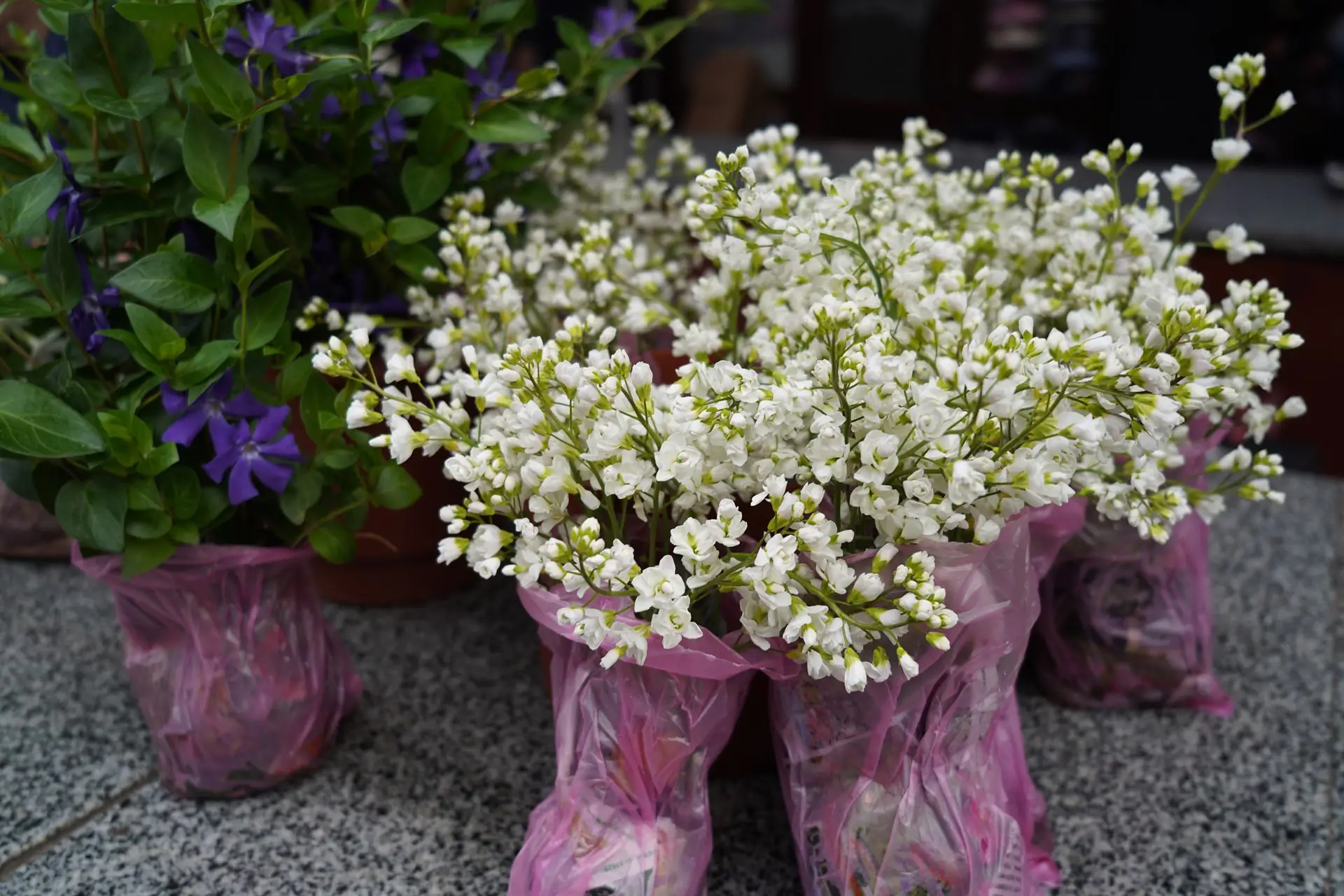 Кущі барвінку, арабісу (резухи) та інші квіти