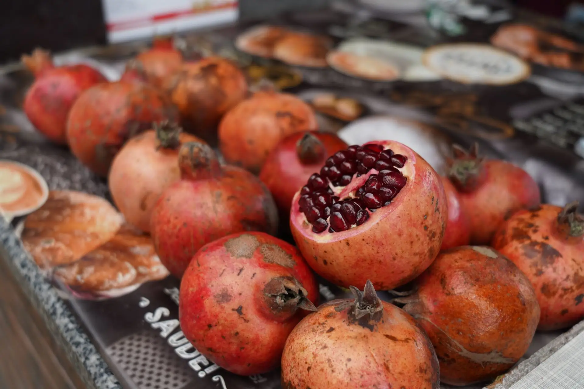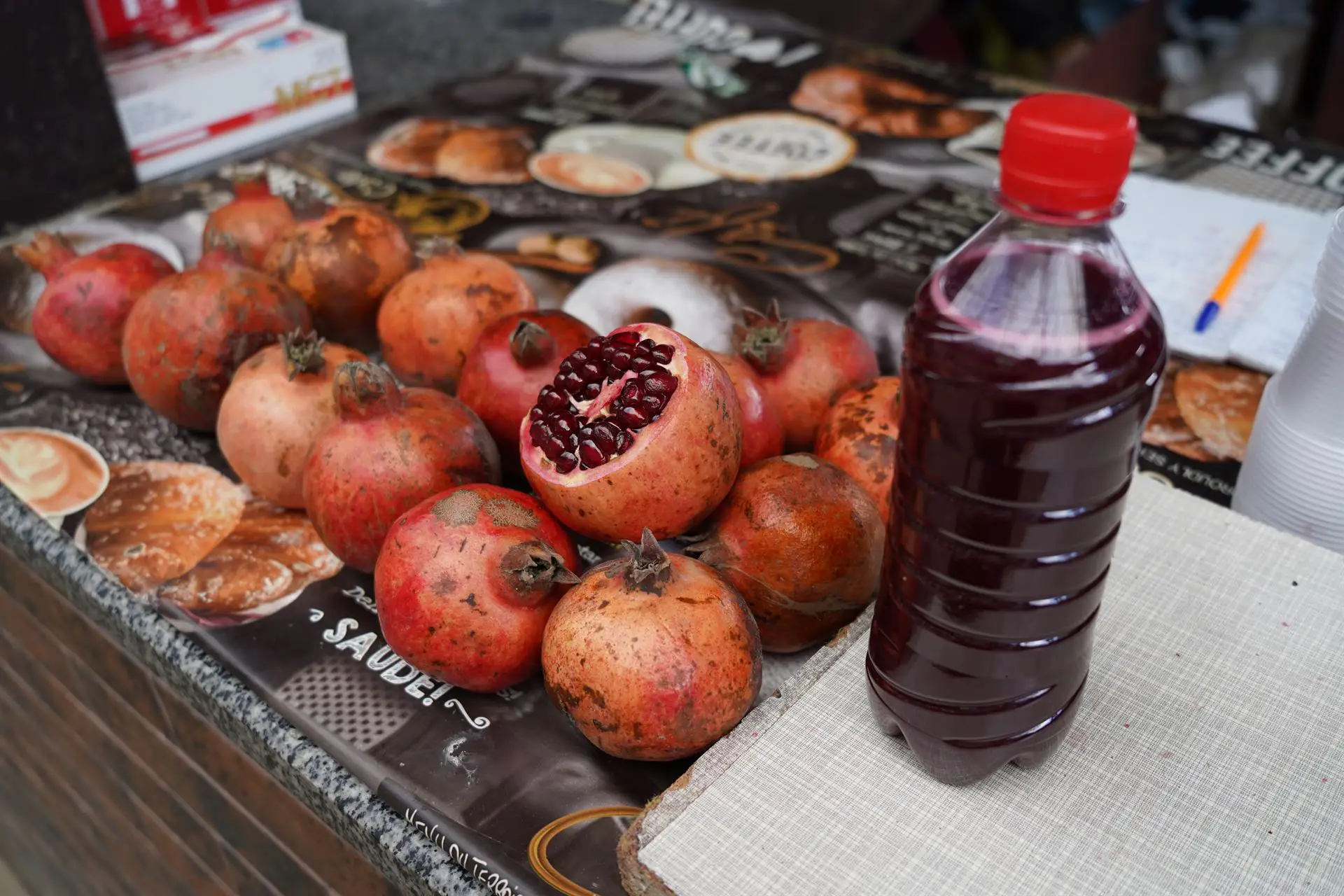 На виході з Селянського базару жінка, яка торгує різними фруктами, вичавлює сік із азербайджанських гранатів.