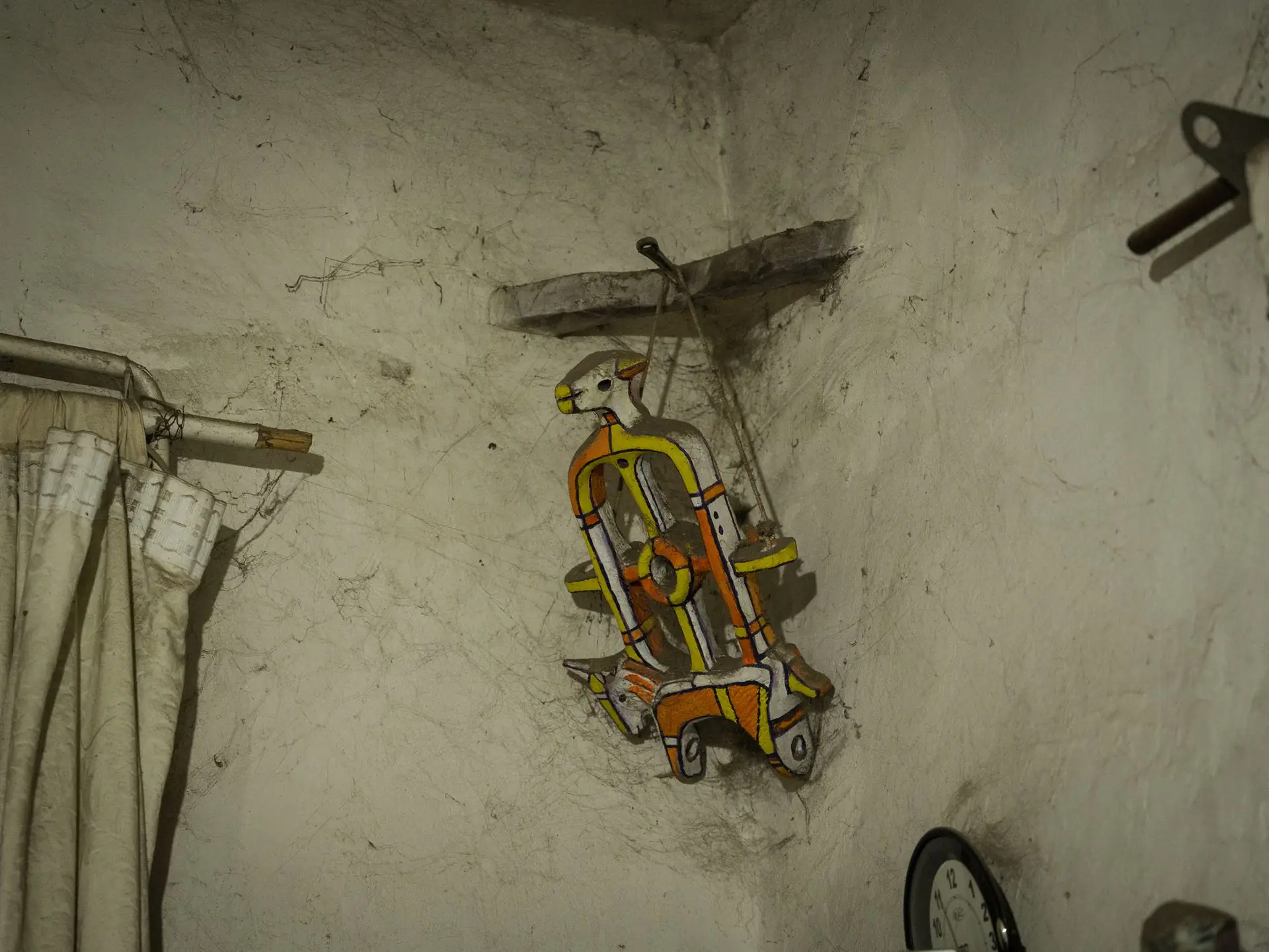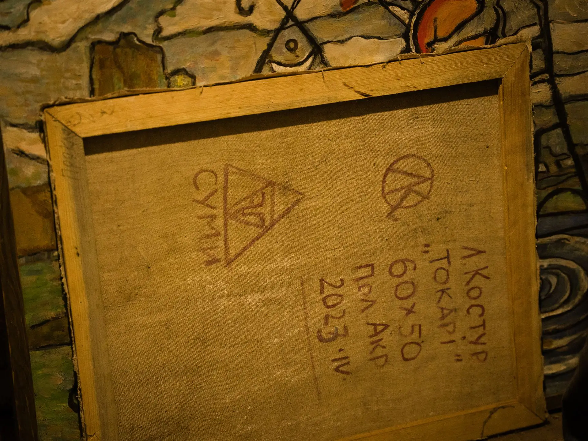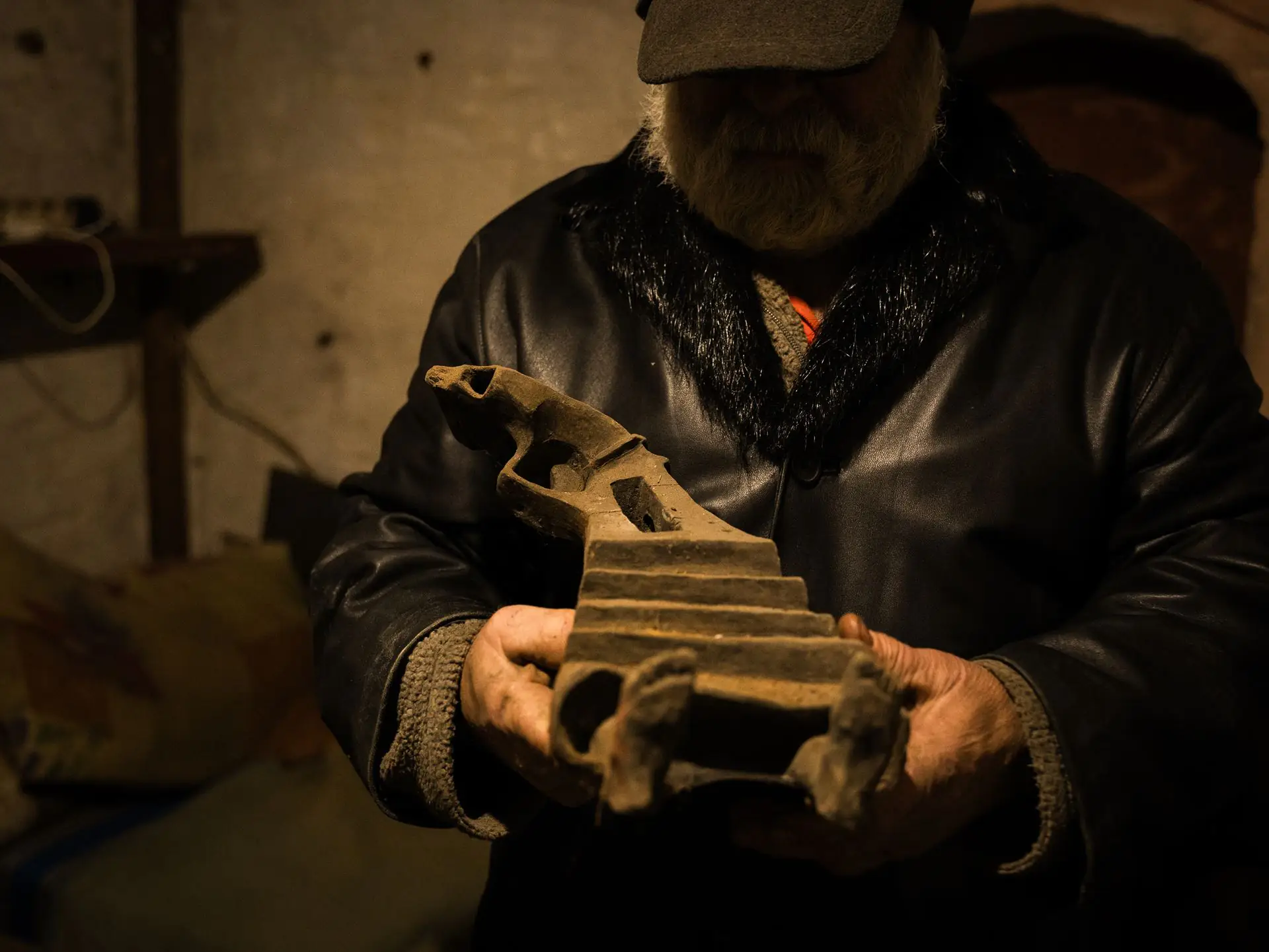 Підвал, де раніше зберігалася картопля, Костур облаштував під бомбосховище. Невелика груба, покладена нашвидкуруч, обігріває простір під землею. Тут стоїть і одна з визначних робіт Леонтія — він не пояснює чому, але дуже просить її сфотографувати. Каже, що цю скульптуру возив на багато виставок.