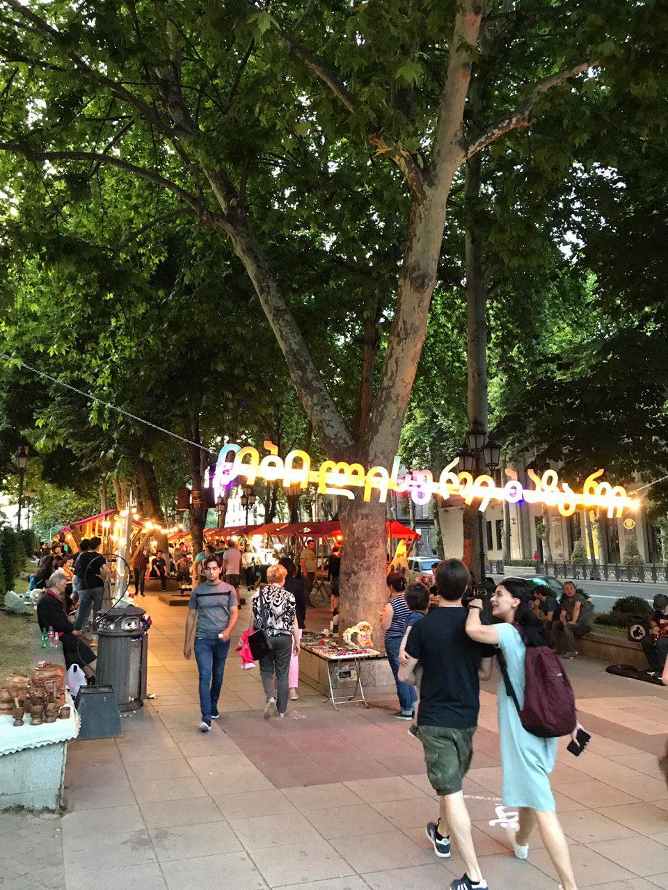 В Тбілісі достатньо спекотно, тому краще в середині дня бути десь або в затінку, або там де є кондиціонер, бо сонце палюче, температура висока, а ще й кругом ходять «гарячі» грузини /грузинки. Коротше, середина дня — найкращий час або для якихось справ в приміщенні де є кондиціонер, або для сну чи іншого «тюленячого» відпочинку. А от коли вже сонечко заходить, то можна вже і на прогулянку виходити.