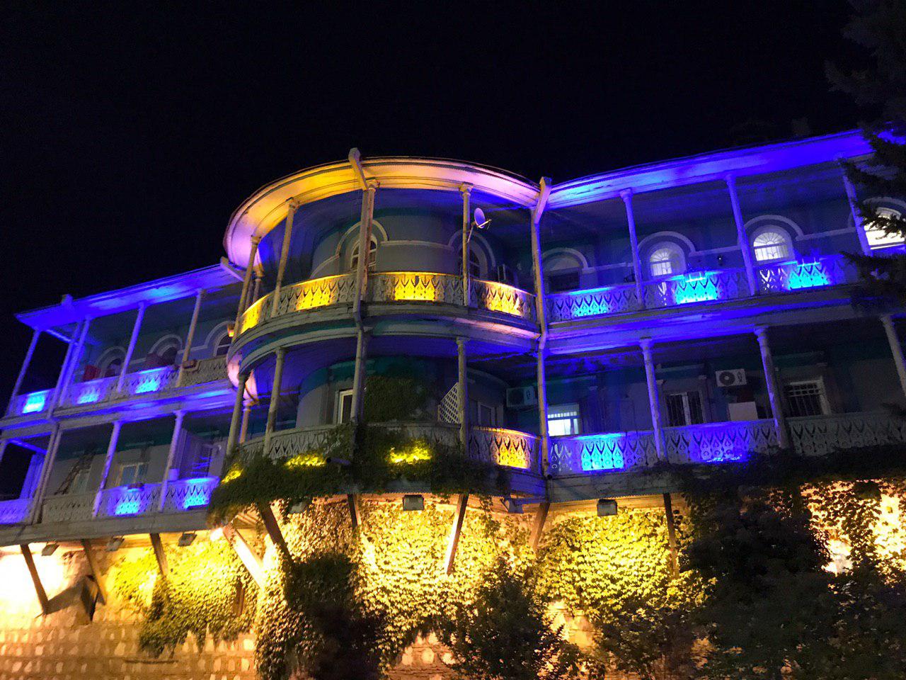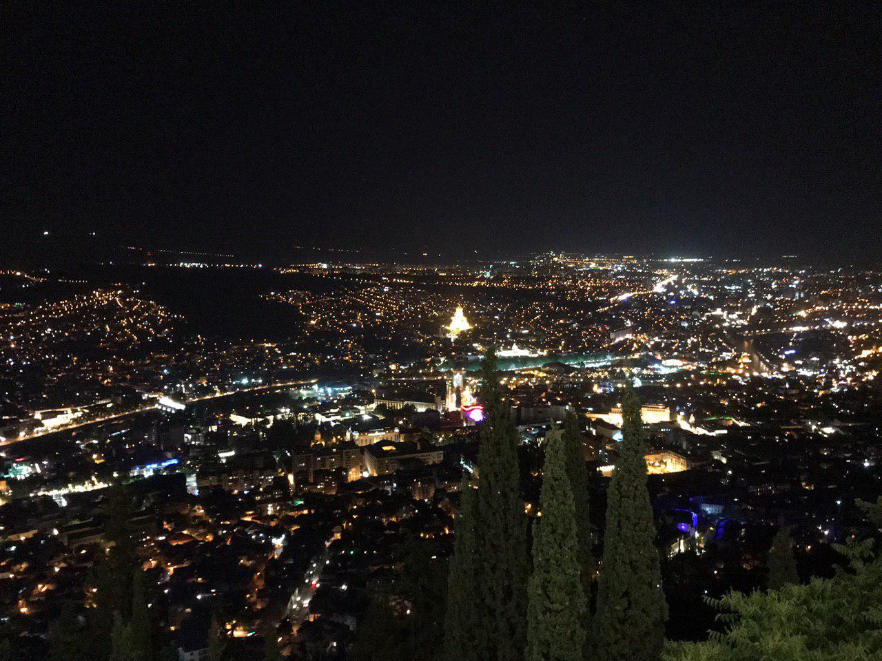 Також на цій горі стоїть велика телевежа, яку вночі освітлюється різними кольорами. Місцеві нам сказали, що кольори постійно змінюються, і дуже часто обираються кольори прапорів дружніх країн Грузії. Коли ми там були — було щось схоже на Італію.