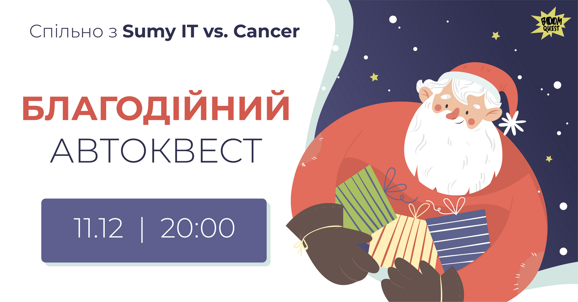Спільно з сумським фондом «Sumy IT vs Cancer», які вже кілька років допомагають онкохворим дітям, «BoomQuest» вирішили організувати благодійний автоквест, який відбудеться 11 грудня. Ігровий внесок — будь-який, але всі гроші будуть перераховані до фонду допомоги онкохворим дітям, реквізити якого вказані після реєстрації.