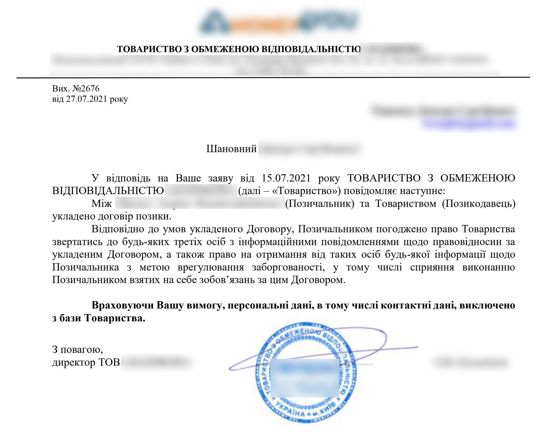 Користуючись правом громадянина, наданим Конституцією України та Законом “Про звернення громадян”, прошу вас відкликати згоду на взаємодію з компанією за моїми контактними даними (номером телефону *** ** ** ***) у зв’язку з тим, що мені невідома особа ********* ********* ***********, стосовно якої я отримую дзвінки з вимогою повідомити їй інформацію про кредит.