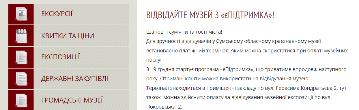 Якщо ви давно говорили собі «Треба сходити глянути, що там у музеї!» — маєте ідеальну можливість відвідати різдвяний захід чи насолодитися мистецькою експозицією. Сумський краєзнавчий музей вже запровадив систему безконтактних платежів, а художній музей планує зробити це на початку січня.
