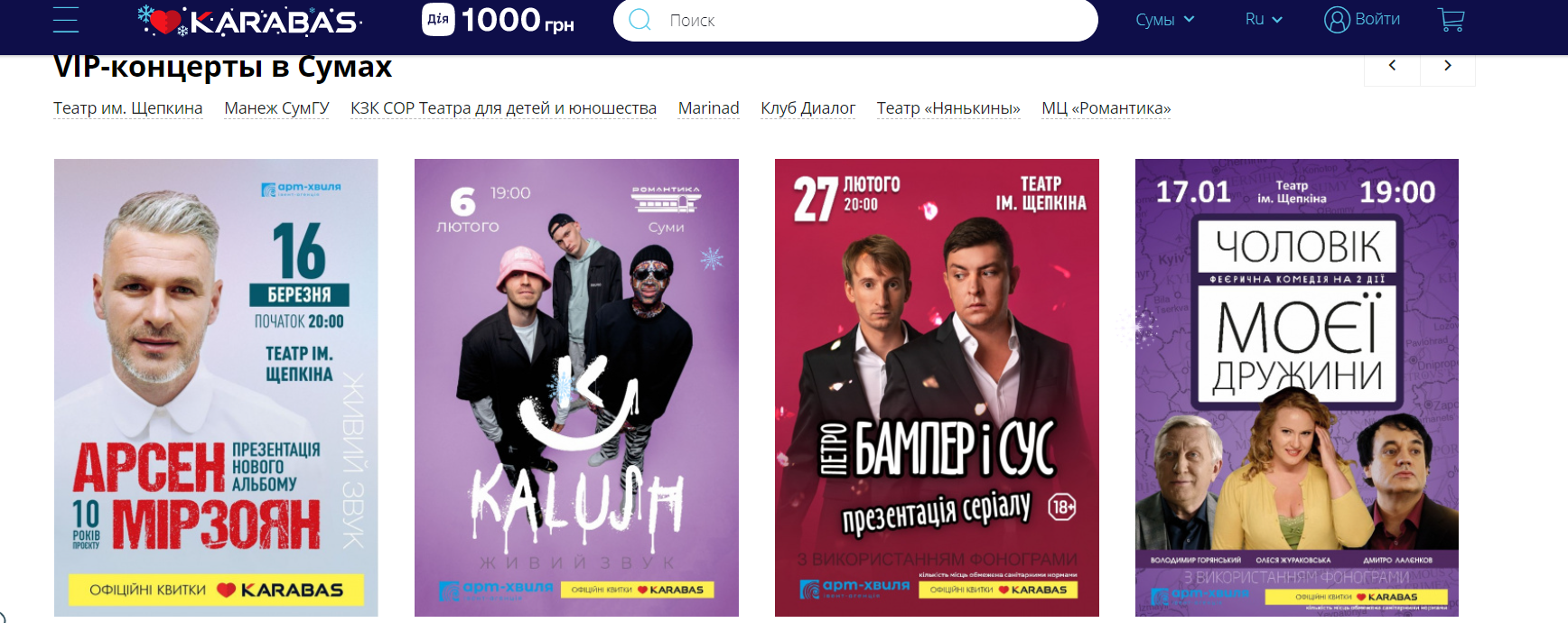 Ви можете придбати квиток на концерт улюбленого гурту чи інтерактивну дитячу виставу до Нового року. Переглянути, які концерти й події відбуватимуться у Сумах найближчі чотири місяці, можна на сайті «KARABAS».