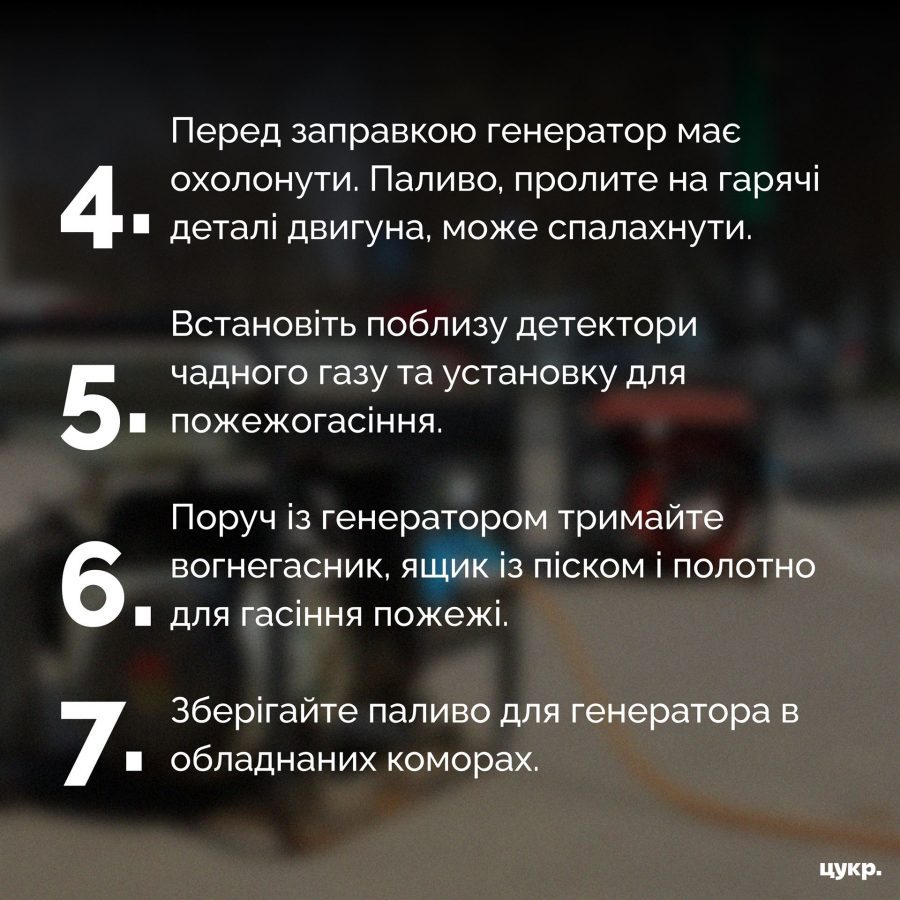 «Вимоги до розміщення генераторів викладені в Державних будівельних нормах. Згідно з ними, пристрої всередині будівлі повинні відокремлюватися від інших приміщень протипожежною перегородкою 1-го типу. Між цим та сусіднім приміщенням також мають бути протипожежні двері та вікна», — говорить Віталій Леоненко, працівник ДСНС.