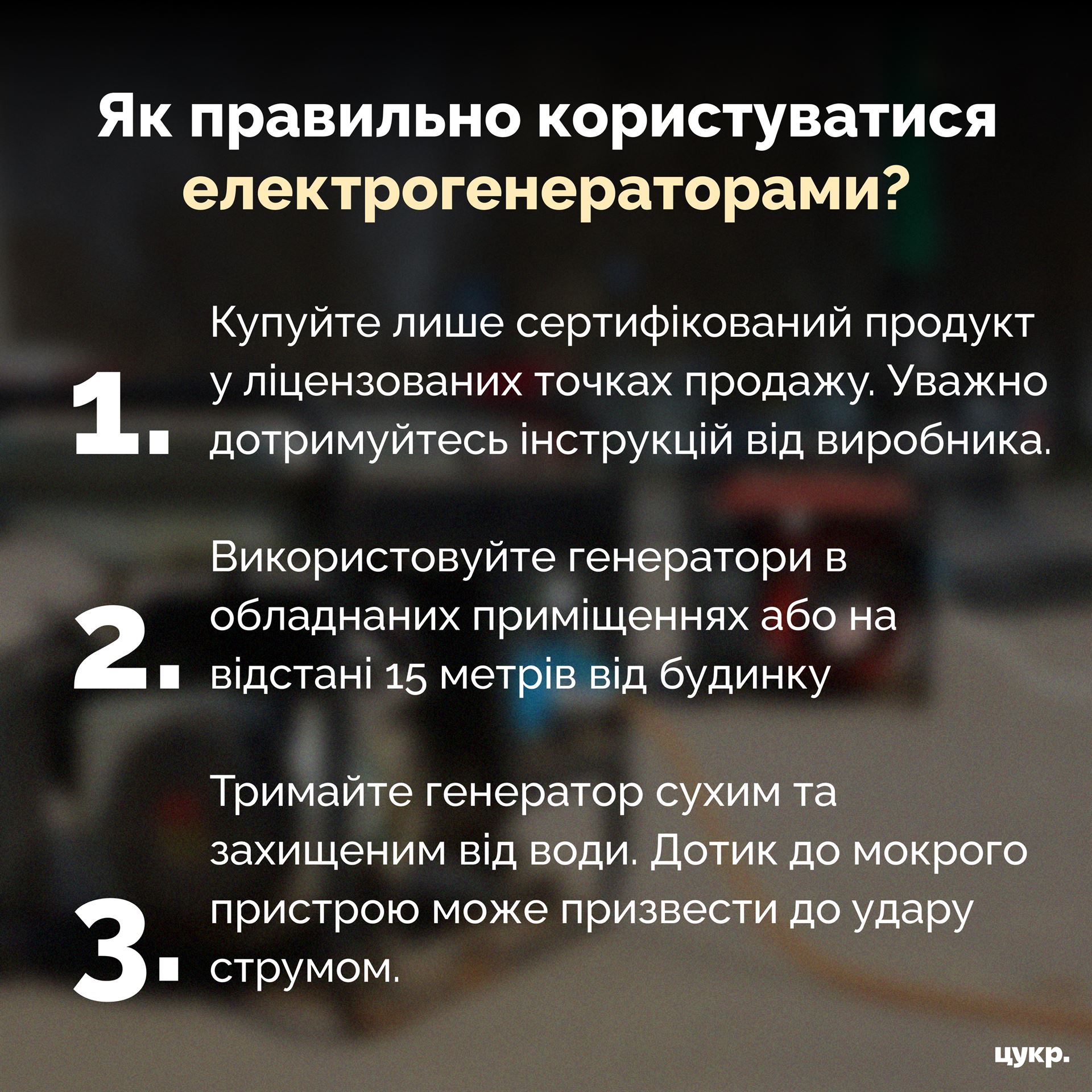 «Але в багатоквартирних будинках можуть бути сховища цивільної оборони. Там можна встановлювати електрогенератори», — наголошує Віталій Леоненко. Приміщення із генератором має дотикатися до зовнішньої стіни будинку і відокремлюватися протипожежною перегородкою, а вихід зі сховища обладнується тамбуром із двома герметичними дверима.
