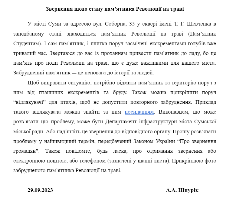 Зараз пам’ятник і територія поруч засмічені екскрементами птахів. Тому ми написали звернення з проханням відмити його та встановити «відлякувачі» птахів. У своєму листі вказали дані відправника й отримувача, описали проблему та запропонували шляхи її вирішення, а також прикріпили фотопідтвердження забрудненого пам’ятника.